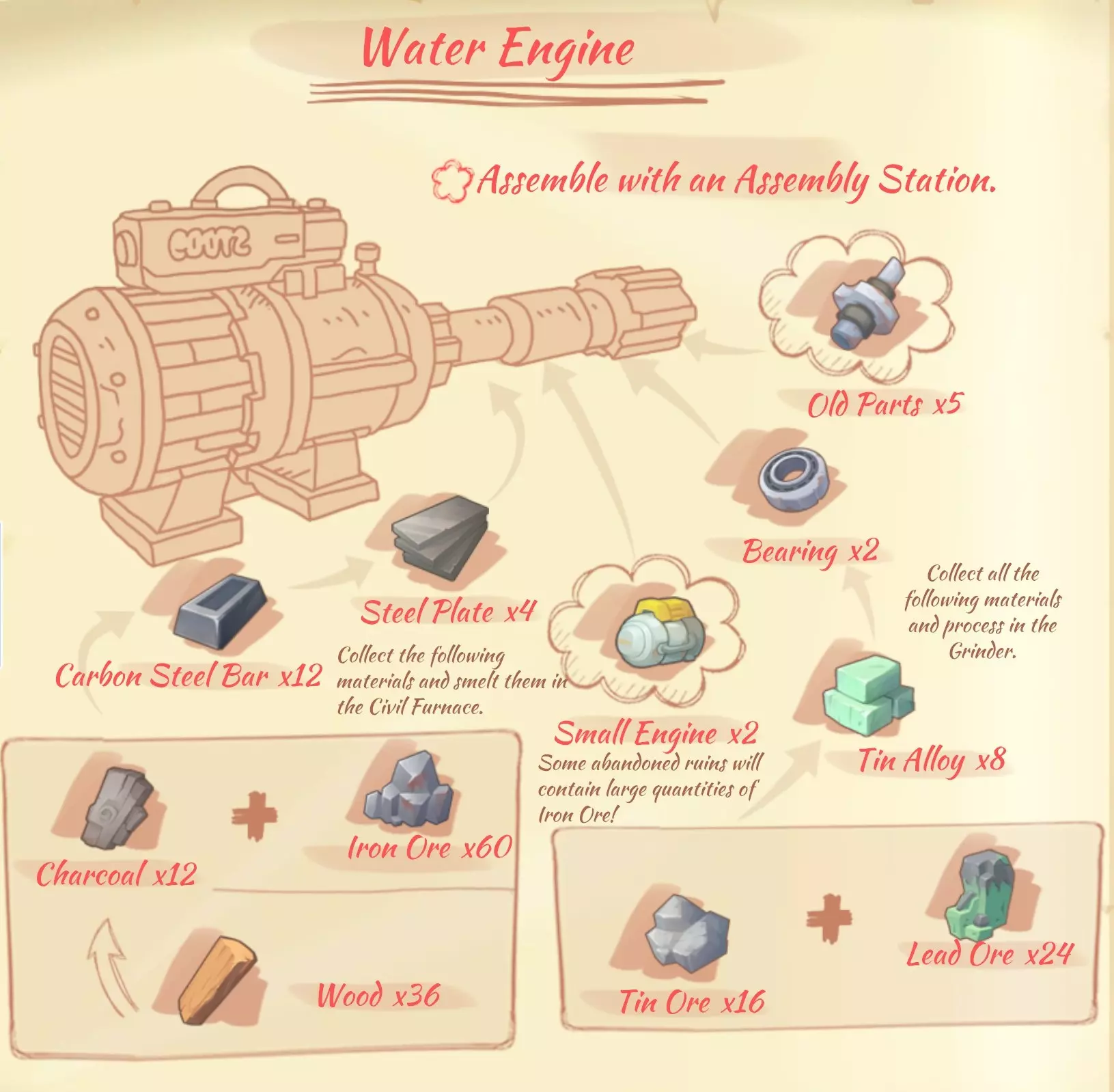 水力引擎(Water Engine):5个旧零件,2个滚珠轴承,2个小型引擎,4块钢板,12个碳锭。