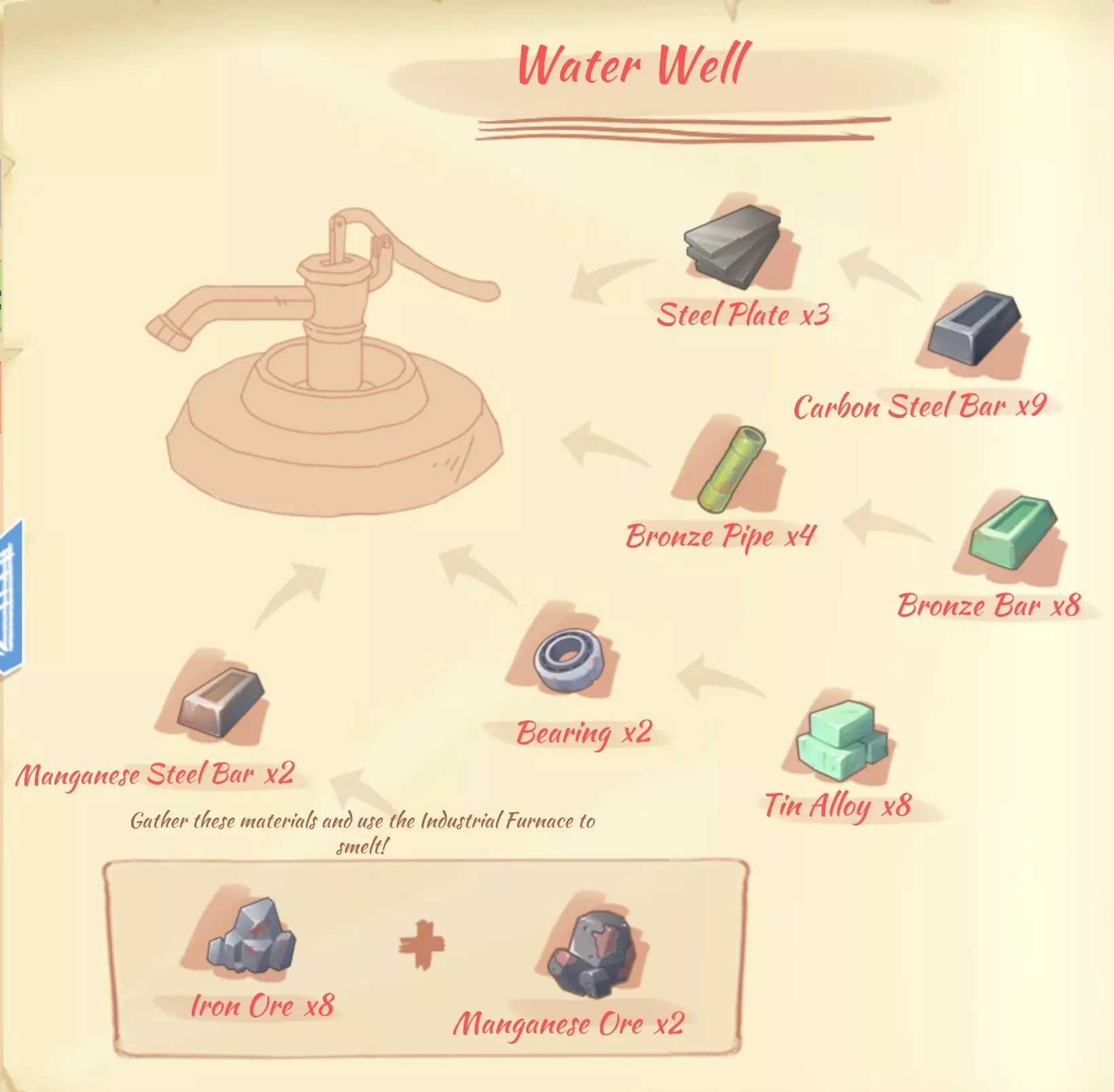 水井:3个钢板,4个青铜管,2个滚珠轴承,2个锰锭。
