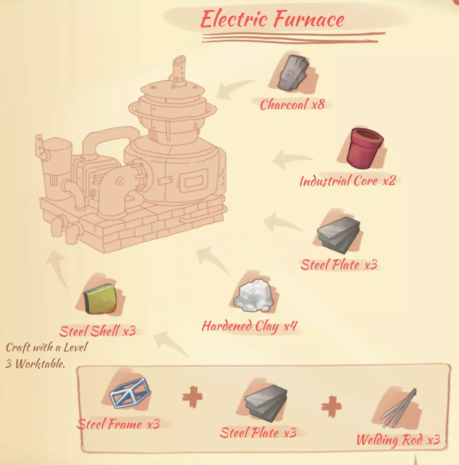 电弧炉(Electric furnace):8个煤炭,2个工业核心,3块钢板,4块耐火黏土,3个钢外壳。