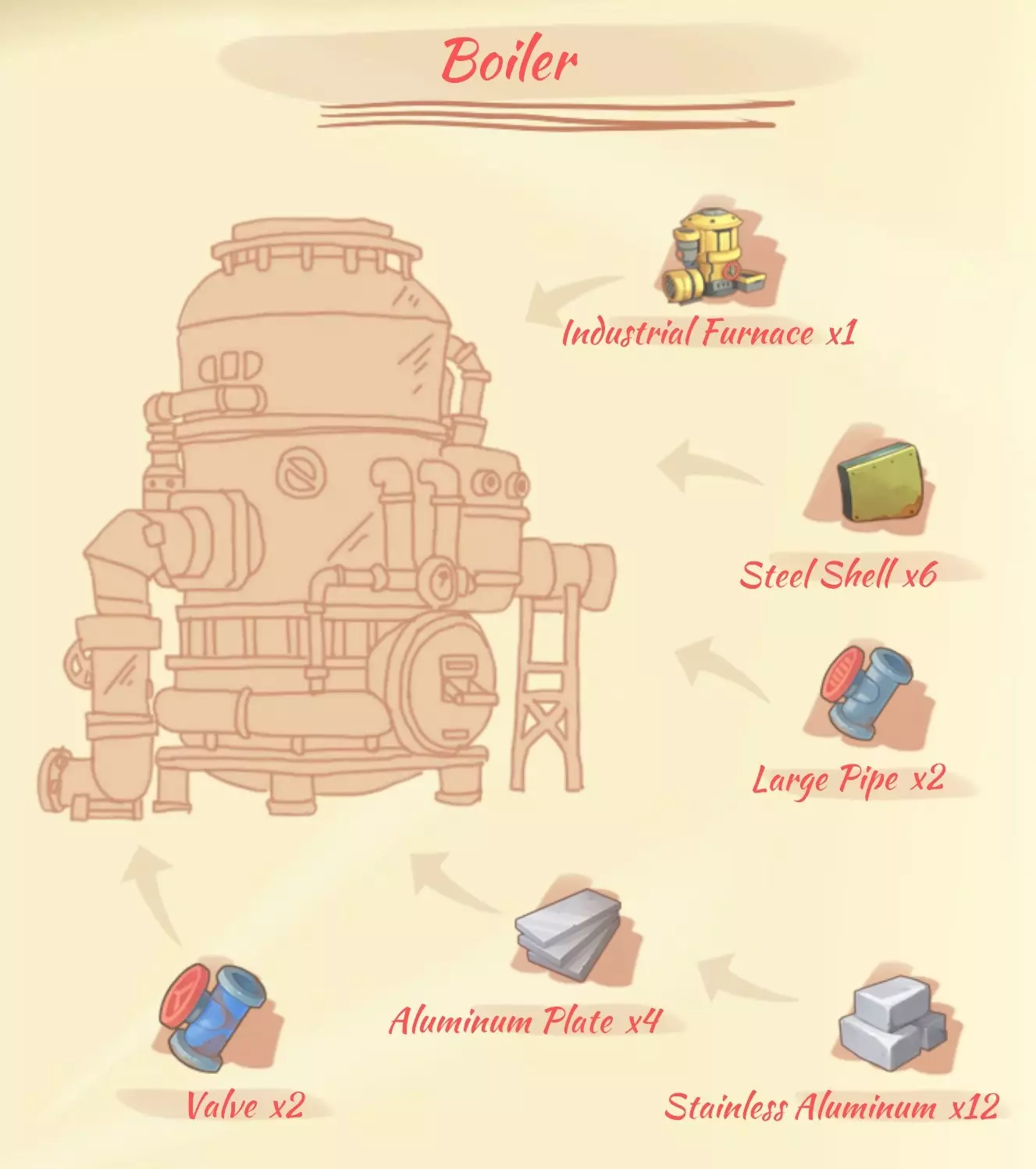 锅炉:1个工业熔炉,6个钢板,2个大管道,4个铝板,2个泵。