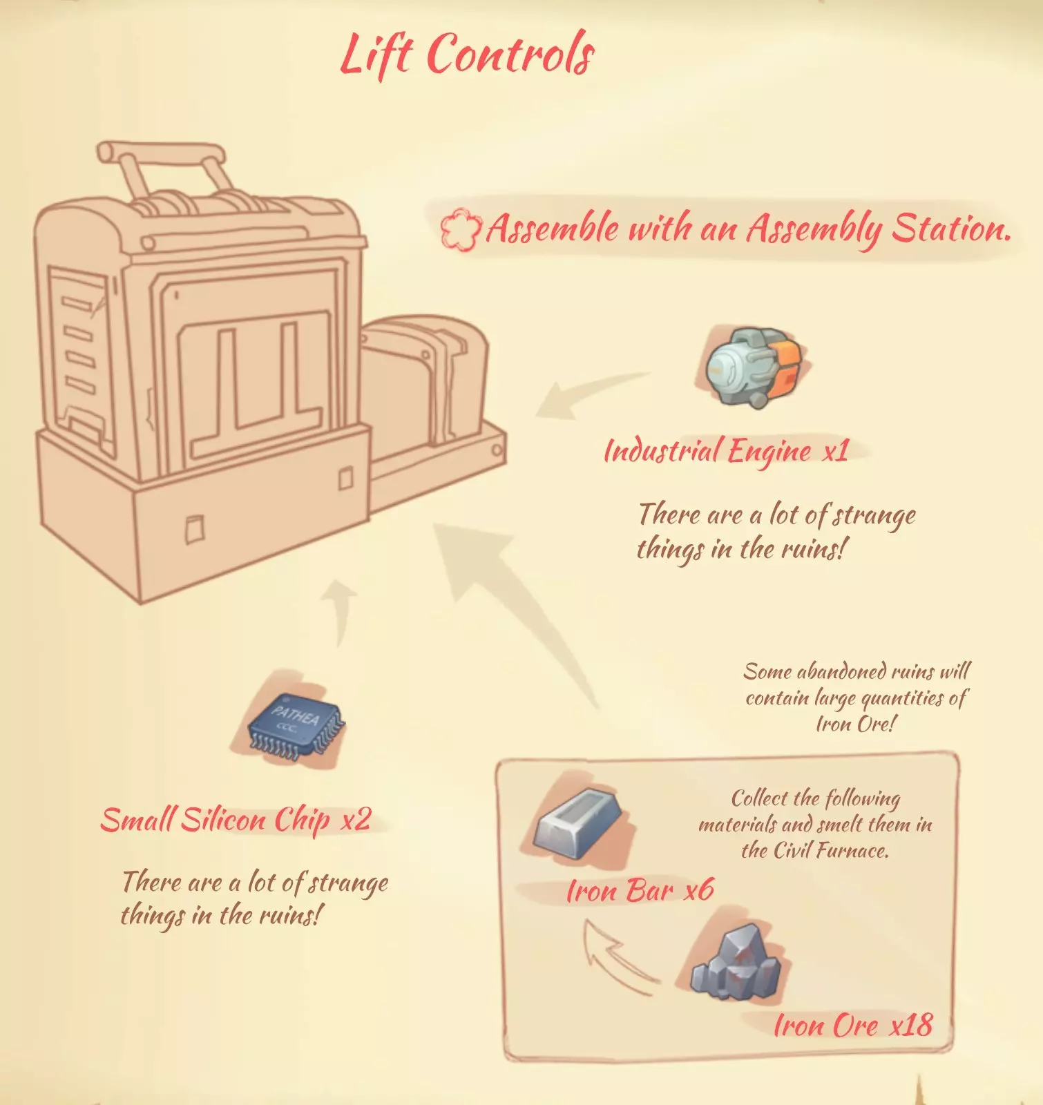 电梯控制面板:1个工业发动机,6个铁锭,2个小型硅芯片