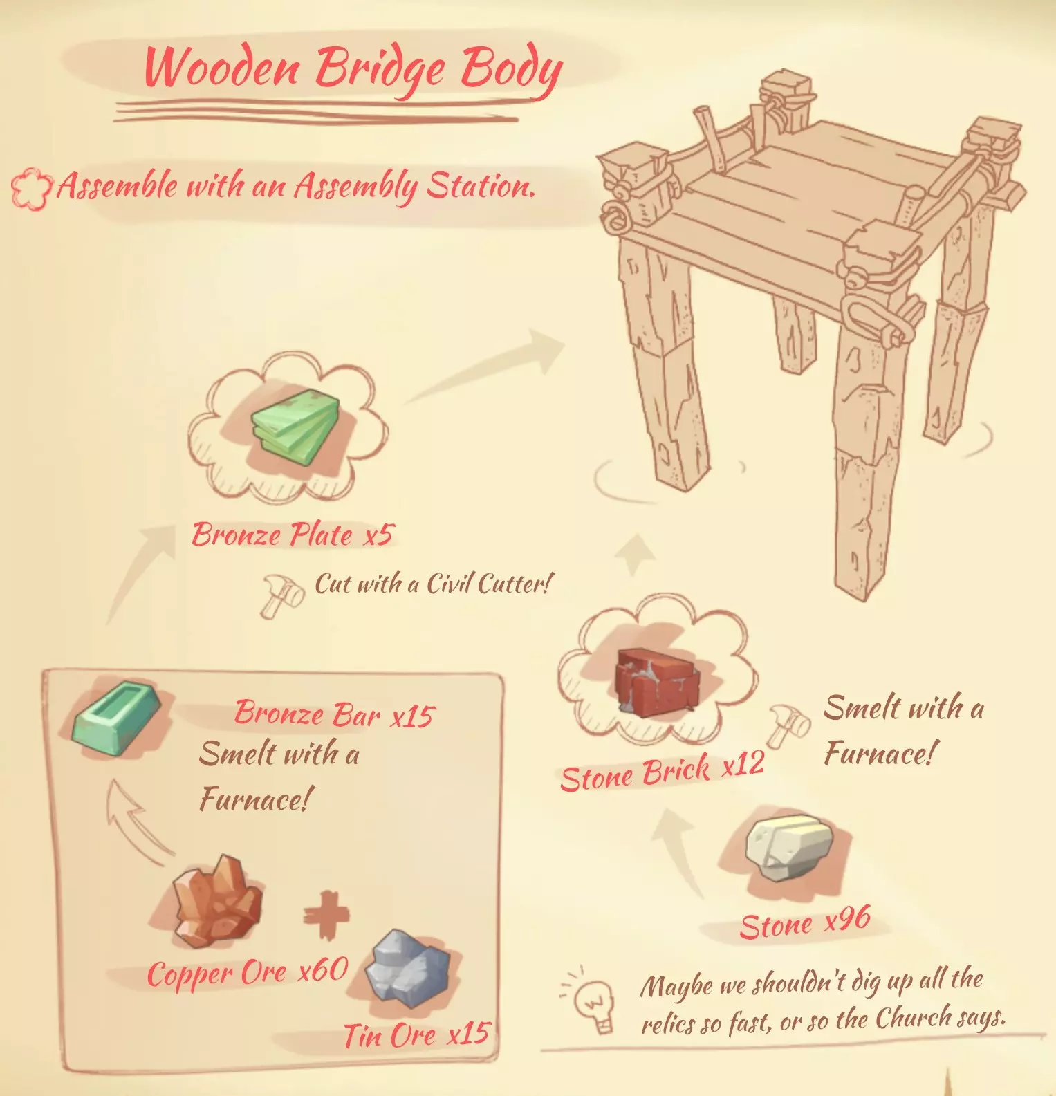 需要立即建造两座熔炉,一座无法满足你的需求。建造好熔炉后,告知普雷斯利,他会让你去找市长(隔壁门,贸易行会右侧)获取建筑许可证。带着许可证回到普雷斯利处,你将获得关于工坊工作的信息以及第一个任务——修理岛上的桥梁。贸易行会内有任务公告板,每天你可以完成一个任务。周末不会刷新新任务。这些任务属于次要任务,能带来金钱和提升声望,但不会影响游戏的剧情推进。建议尽可能完成这些任务,因为之后会需要用到钱。初期赚的钱应该用来扩大背包容量,游戏中的资源非常多,但背包空间总是不够用。另外,别忘了在自己家里挂上建筑许可证,这能让你的能量值增加20点。房子可以也需要用各种内饰物品来布置,这会提升你的属性。 要成功建造桥梁,首先应该前往废弃遗迹。进入遗迹需要付费,支付后可无限制使用一周。你会获得用于考古挖掘的特殊装备,但首先你需要开采更多的铜矿,用鹤嘴锄挖掘棕色的泥土。在制作方面,应优先将斧头和镐子升级为青铜材质,这样你就能砍伐大树和敲碎大石块了。升级工具的套件可在城市中研究中心附近购买。当深入一些地方后,戴上特殊眼镜并寻找发光点,专注于其中一个点并朝着正确方向挖掘,就能获得某个 artifact。在挖掘过程中,你一定会找到光盘。其中一张需要交给神父,另一张则要交给研究中心。之后,研究中心会根据光盘提供新的图纸,而教会则会提升你的 farming 能力。 想必你已经注意到,任何行动都会为你带来经验值,让你获得等级提升。首先应该优先将【 bonus experience】获取提升到最高等级,因为提升得越早,最终获得的额外经验就越多。接下来需要升级斧头和鹤嘴锄的技能,这样在砍树和挖矿时就能节省大量体力。完成这些之后,技能升级的方向就不那么关键了,可以根据自己的意愿来选择。 回到桥梁的话题。除了熔炉外,你还需要圆锯和磨床。制作所有必要的零件,并在装配站建造桥梁的所有部件。