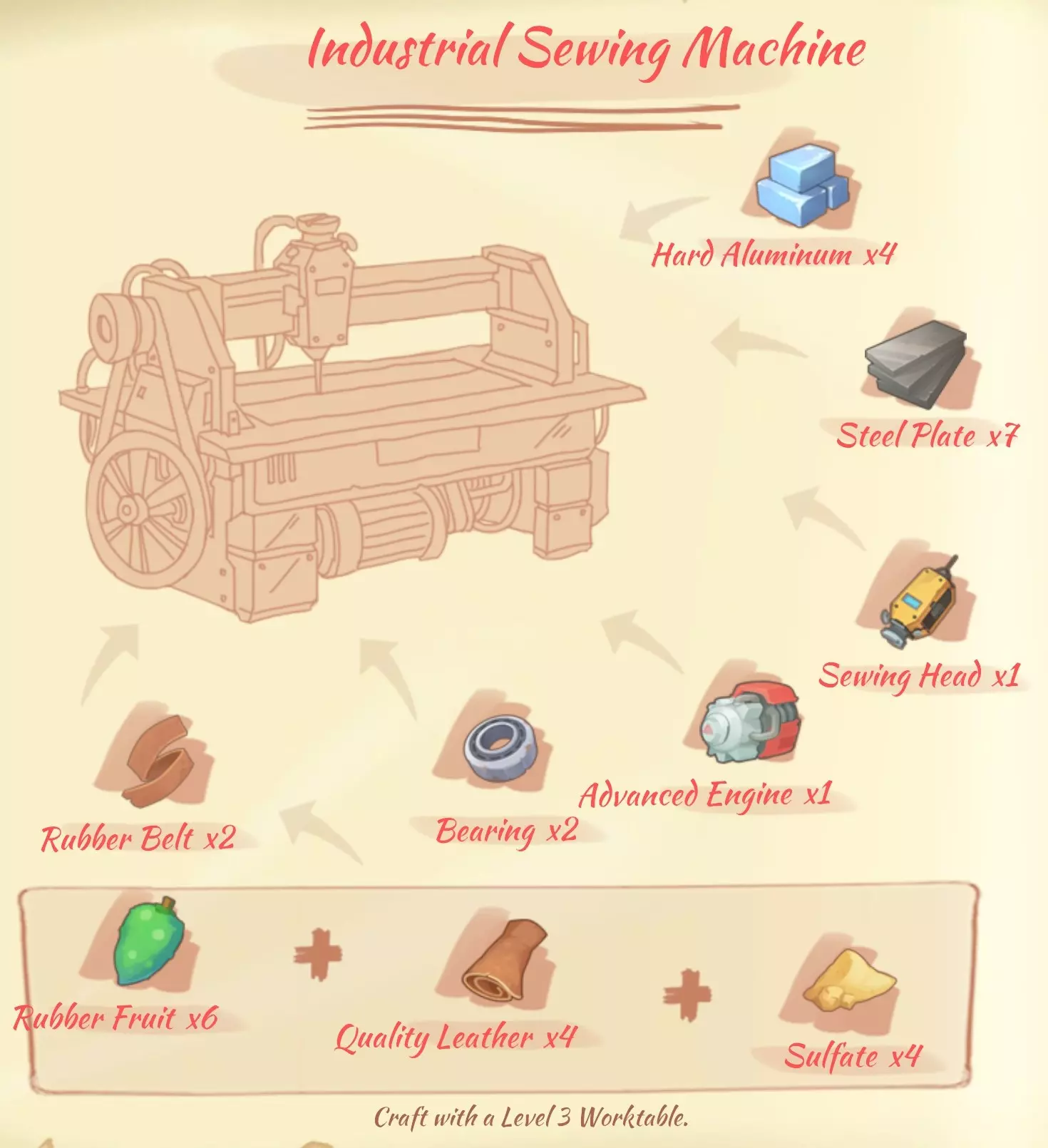 工业缝纫机:4个硬铝,7块钢板,1个压脚(获取蓝图时获得),1个现代发动机,2个滚珠轴承,2条橡胶带。