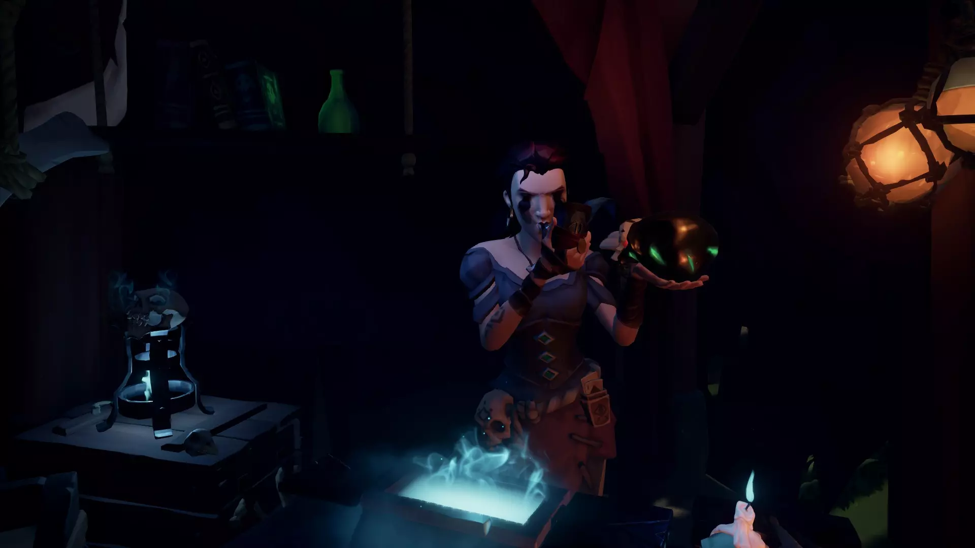 我们把龟甲交给奥利维娅夫人,此时她瓶中的酒已经喝得差不多了,于是她决定抽起心爱的魔法草药烟斗。