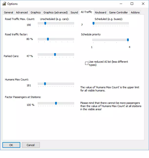 道路交通最大数量:未计划 设置地图上行驶的车辆(汽车、卡车等)数量。这是最重要的设置之一,因为AI车辆需要大量CPU资源。为获得良好性能,请保持较低数值。您需要在周围交通量和良好性能之间找到合适的平衡。 道路交通系数 omsi具有随时间变化的交通密度,通过此选项可影响交通密度。较低数值会带来更好性能,但街道也会更空旷。 停放车辆 omsi有固定的停车位。此数值设置使用的停车位数量。停放车辆对性能的影响不如行驶中的车辆大,但会增加需要渲染的物体数量。 人类最大数量数量 设置地图上的人类数量。它还会限制你可搭载的最大乘客数量。人类也需要大量CPU资源(虽然不如载具多,但仍然相当多)。为了获得良好性能,请勿将此值设置过高。 车站乘客系数 根据时间段的不同,等待公交车的乘客数量会有所变化。通过此数值,你可以对此产生影响。 道路交通最大数量:已规划 设置地图上行驶的公交车、电车、火车等的数量。为了获得良好性能,请将此值保持在较低水平,建议不超过10。 时刻表优先级 不同的公交线路具有不同的优先级。主要公交线路的优先级非常高,而其他仅由AI运营的线路则不太重要。如果将此值调低,你会看到越来越少的其他公交车、电车、火车等。为了获得良好的多样性,请将此值保持在4,并减少“道路交通最大数量:计划内”。 使用精简AI列表 我不确定此选项是否真的有任何优势。你可以自己尝试... 如何提升性能(最重要事项总结) 首先: 减少相邻区块数量(1-2个) 关闭阴影 将“道路交通最大数量:非计划内”设置为100以下 将“道路交通最大数量:计划内”设置为10以下 将“人类最大数量”设置为150以下 降低道路交通系数 将“最大声音数量”设置在250到400之间 降低“最大物体和地图复杂度” 缩短“最大物体可见距离” 之后,尝试其他设置。找到最佳设置需要一些时间。由于每台电脑的情况都略有不同,因此没有通用的解决方案。结语 希望本指南能帮助你找到适合自己电脑的最佳设置。我必须承认,我并非对所有设置都有经验,但我认为已经涵盖了最重要的部分。 所有内容仅供参考。祝你玩《巴士模拟》愉快!