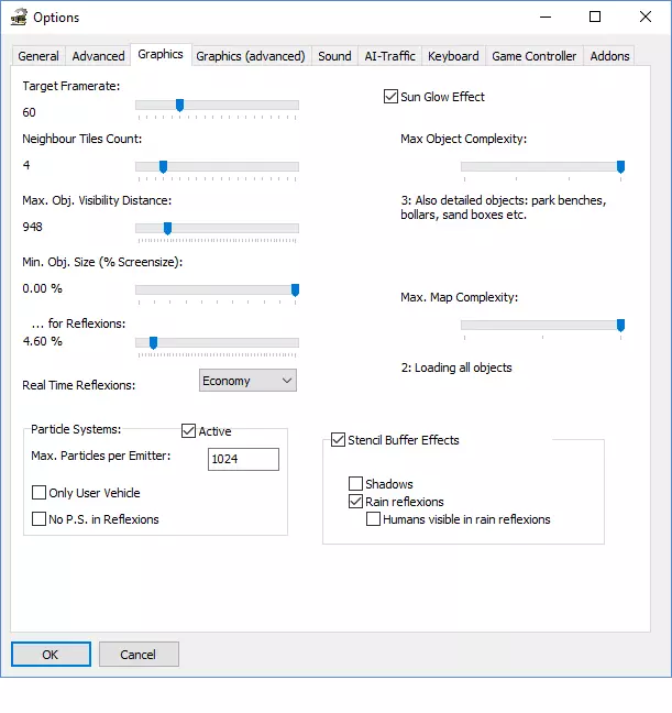 目标帧率 限制最大帧率 相邻区块数量 每个方向上的区块数量。1表示加载9个区块,2则会加载你周围的25个区块。此选项对性能影响较大。一个有趣的事实是,【OMSI】具有动态区块数量减少功能。更多相关内容请见【图形(高级)】设置。 最大物体可见距离 当你与物体之间的距离大于该数值(以米为单位)时,物体将不会显示。降低此数值可以提升性能,但如果数值过低,你可能会看到物体在你面前生成,并且可能会错过交通标志和交通信号灯。 最小物体尺寸(屏幕尺寸百分比) 当物体小于此数值时,将不会显示。此选项用于防止渲染过小的物体。我对于性能影响的大小没有太多经验。 关于反射效果: 如果物体小于此数值,其反射将不会显示。反射大多只是一些纹理,所以这个选项应该不是很重要。 实时反射: -->无:镜子功能关闭 -->经济模式:必要时镜子会以较低帧率渲染。原本,这意味着镜子会逐个渲染,例如有3面镜子时,每面镜子的运行帧率为游戏帧率的1/3,但(我认为)在1.6版本中,不可见的镜子无论如何都不会被渲染。这意味着在此设置下,镜子通常不会出现太多卡顿 -->完全模式:所有可见镜子都以与游戏相同的帧率进行渲染。我不推荐此设置,因为它会显著降低性能。 粒子系统 根据我的经验,它们对性能影响不大,但能增添一些不错的细节。粒子系统包括汽车、公交车和烟囱的尾气,以及湿滑路面上的水花。只有在其他设置未能充分改善性能的情况下,你才应该调整此设置。这种情况下,首先减少“发射器最大粒子数”。 【仅用户载具】:只有你的公交车会产生粒子效果 【反射中无粒子系统】:后视镜中无粒子效果 物体最大复杂度 指地图上显示的细节量。对于免费内容,其功能可能有限(因为物体的优先级由物体创建者设定)。此选项有助于提升性能,或可解决白色纹理问题。 最大地图复杂度 设置主区域外物体的显示距离。由于优先级由地图创建者在地图编辑器中设定,该功能可能存在限制。降低此设置可略微提升性能。 模板缓冲效果 ——阴影:建议始终关闭此选项。它对性能的消耗远大于其对画质的提升,可能会使帧率降至原来的三分之一甚至一半。 ——雨水反射:即湿润的街道效果。该效果能显著增强画面表现,仅在雨天街道导致帧率大幅下降时才考虑关闭。 ——雨中人物反射:我对此选项没有使用经验,从未启用过。建议自行尝试。图形(高级)