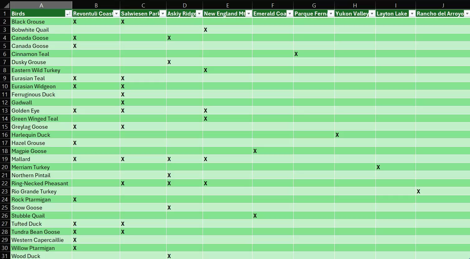 鸟类图鉴 最后但同样重要的是,我制作了一个用于观察鸟类的电子表格。我首先选择了鸟类种类最多的保护区,然后补充了缺失鸟类的信息。