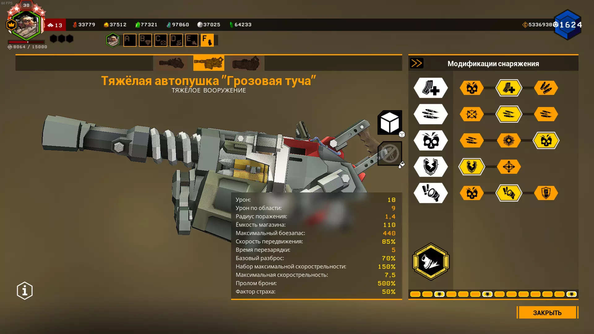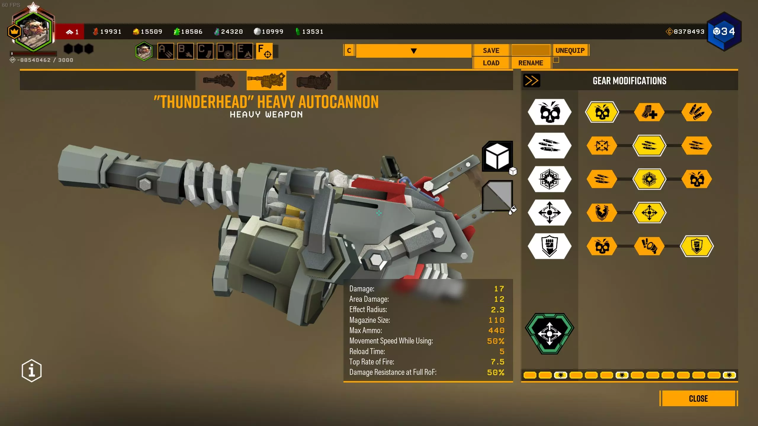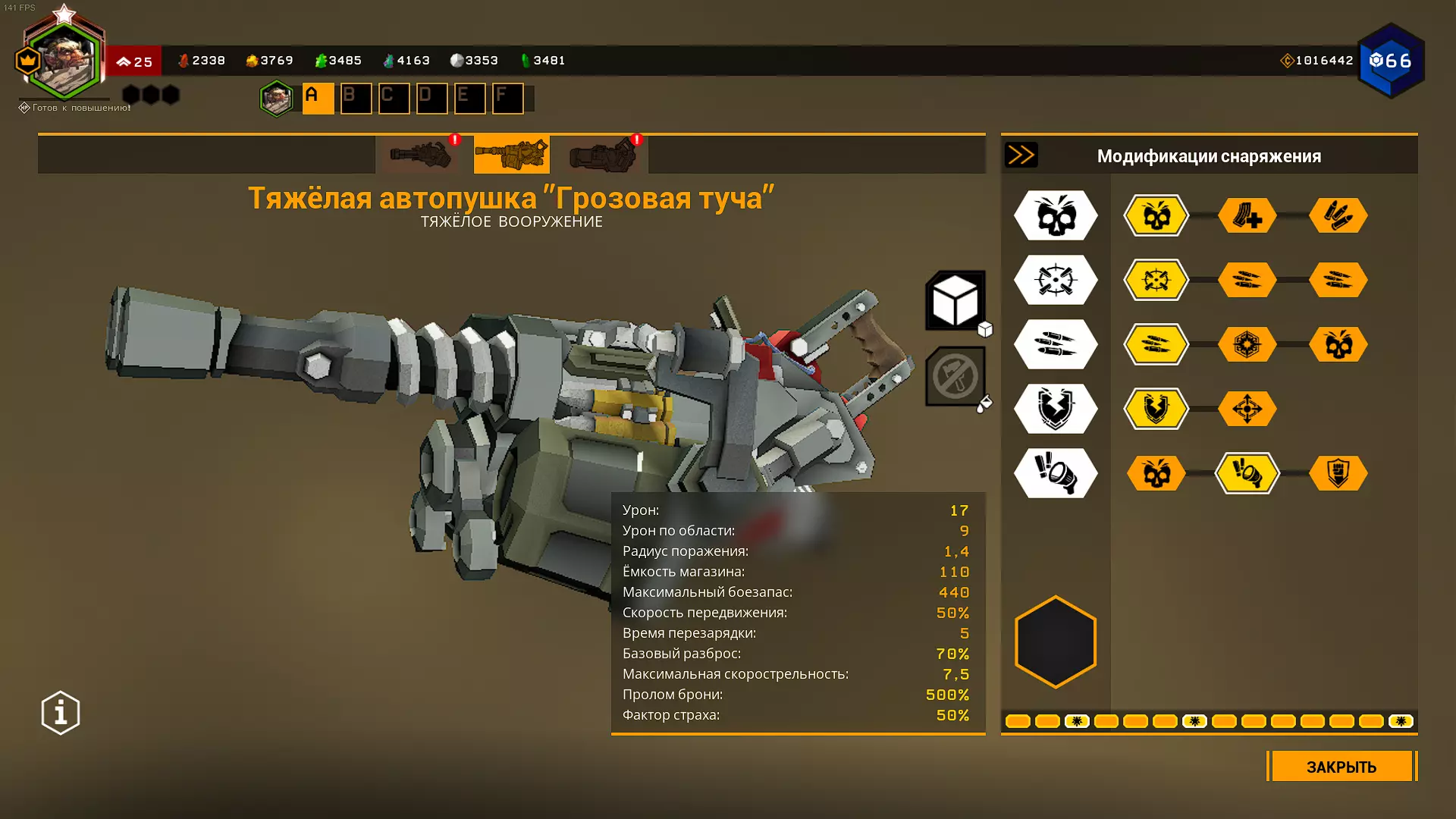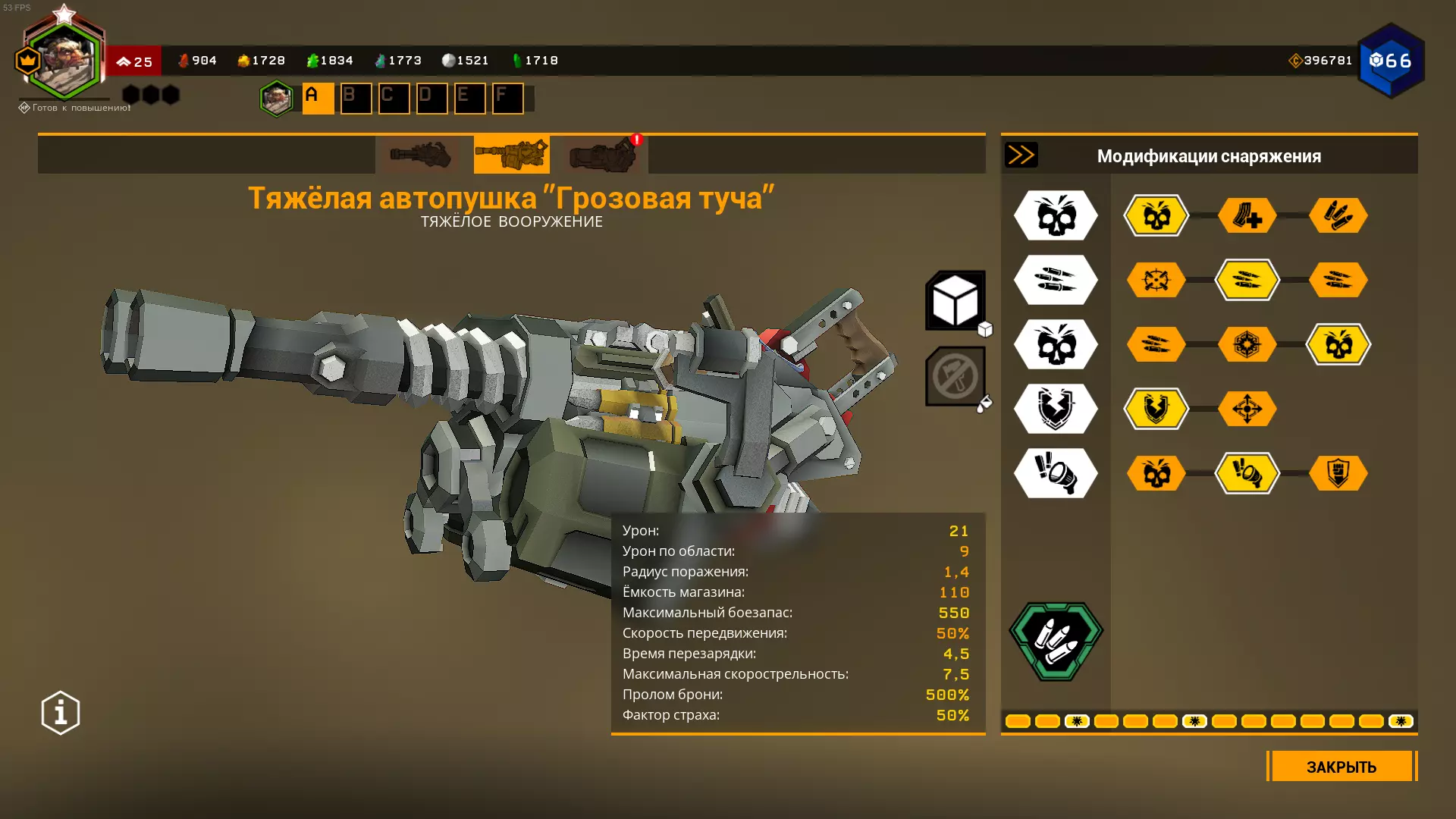 在1级天赋中,可选择增加弹夹容量或弹药数量。 在2、3、4级天赋中,选择很明确:增加射速、增加2点范围伤害和增加范围半径。 在5级天赋中,可以选择恐惧效果来提升生存能力,但这样你将不得不消耗更多弹药来对付敌人集群,因为敌人会四散奔逃。选择T5A是为了在自动炮以最高射速射击9发后出现集群断点,但如果不需要的话,可以选择T5C抗性。我在模组难度下使用的配置: