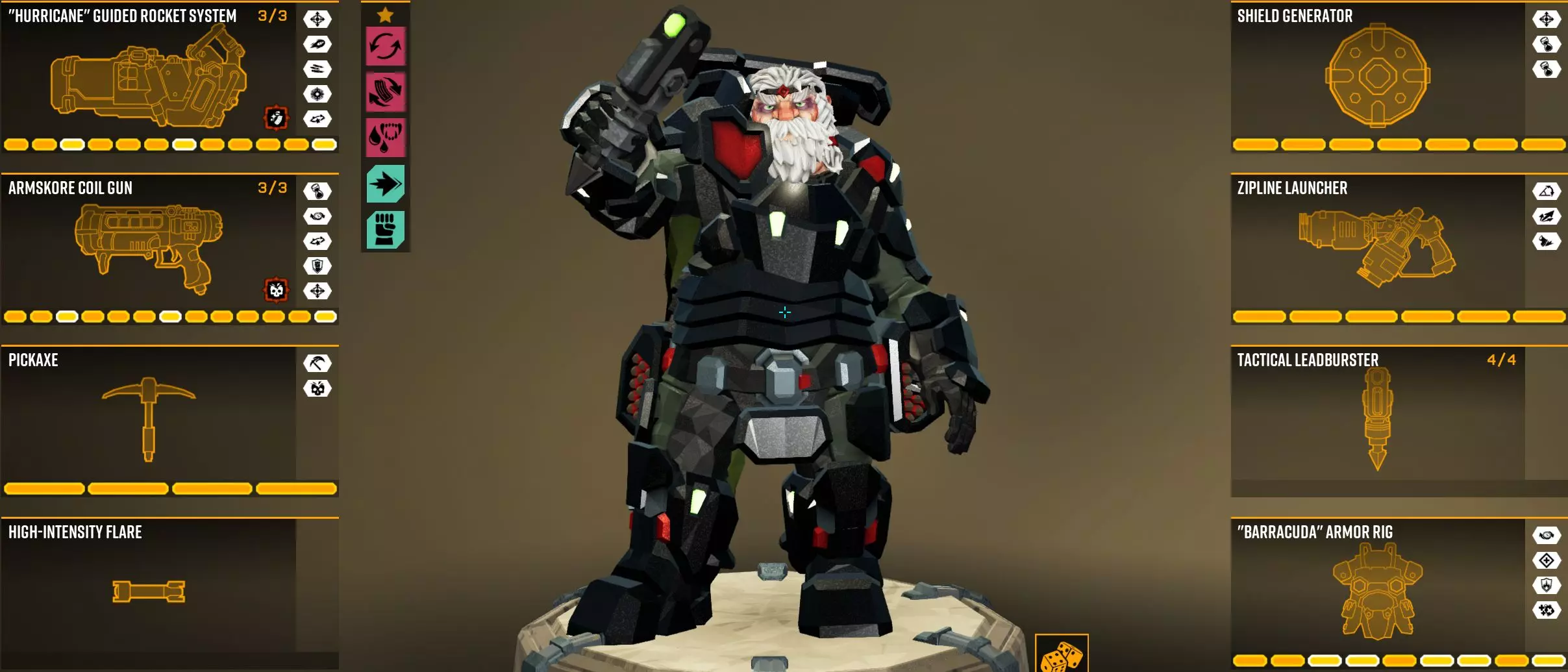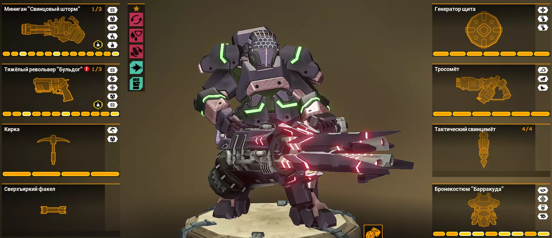镐子必须升级攻击力。用它可以击杀劈砍者、破坏者,打掉压迫者三分之一的生命值,在第五波加上怪物密度加成的情况下还能击杀普通小怪。(侦察兵可以带充能技能,但我不带,因为很多矿石不用镐子也能跳上去,而攻击力在突发情况下非常关键。) 护盾发生器