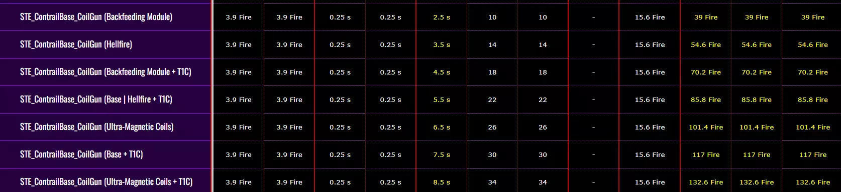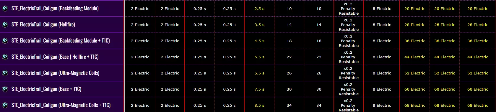 模组:充能指示器 在3级(或3阶)时,我们可以在眩晕和恐惧之间进行选择。 选择眩晕后,我们在射击时有50%的概率使射击点周围1.5米范围内的虫子陷入眩晕状态,该眩晕效果持续3秒。 这项改进能让我们更有效地利用轨迹伤害,因为虫子会停留在轨迹中并持续受到伤害。当射击时获得恐惧效果,会在射击位置周围生成一个半径5米的恐惧光环,该光环能以250%的概率惊吓所有虫子。这为我们自身以及队友提供了极其强大的自我保护能力,几乎能应对所有类型的虫子。不过处于恐惧状态的虫子会逃跑。 建议先选择能造成持续伤害的武器,我们将通过一些超频来获得恐惧效果。在4级天赋中,最好选择抗性——50%的全伤害类型抗性,这非常可观,能在高斯炮充能开始时减免一半伤害。另一个选项除了特定的超频外,实用性较低。 在5级天赋中,最好选择范围——轨迹伤害会叠加,增大的范围能击中更多虫子,从而简化清理虫群的过程。T5C是一个相当不错的强化,能够对处于轨迹内的敌人造成额外伤害,不让虫子离开轨迹。 电轨迹伤害数据:
