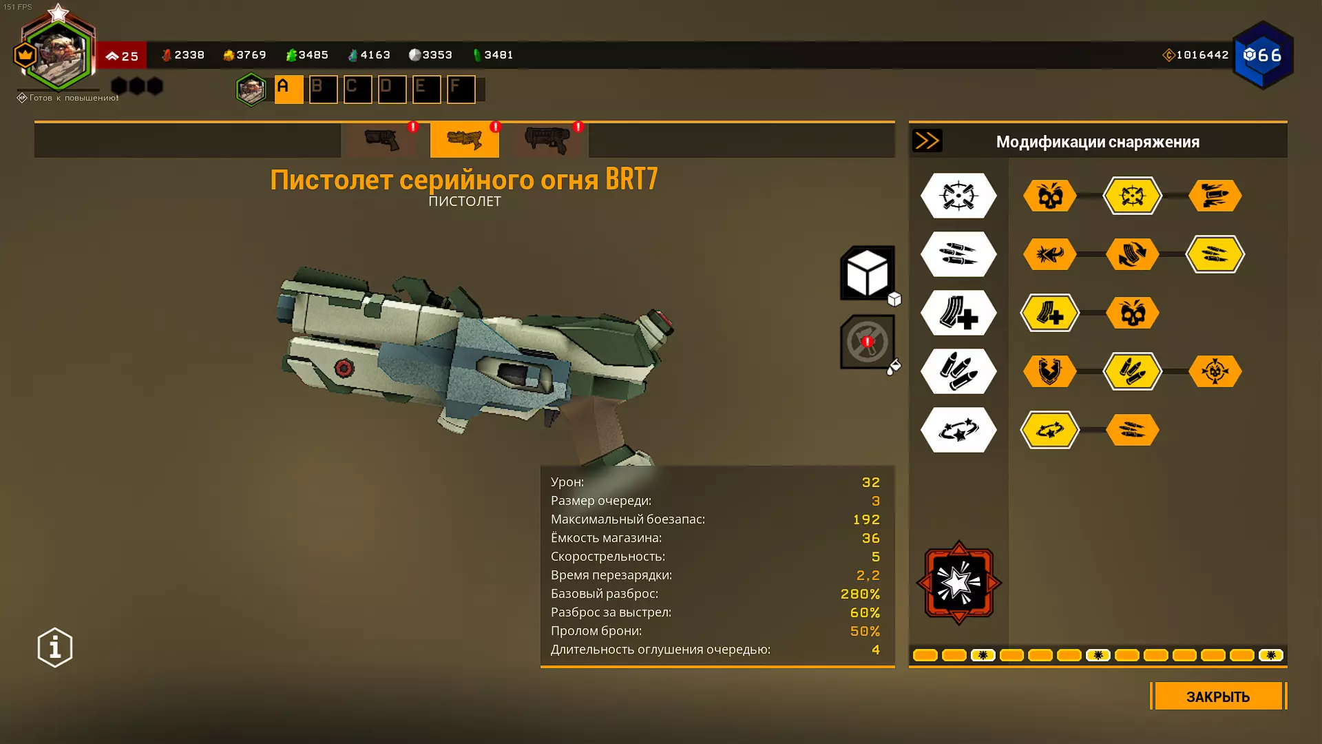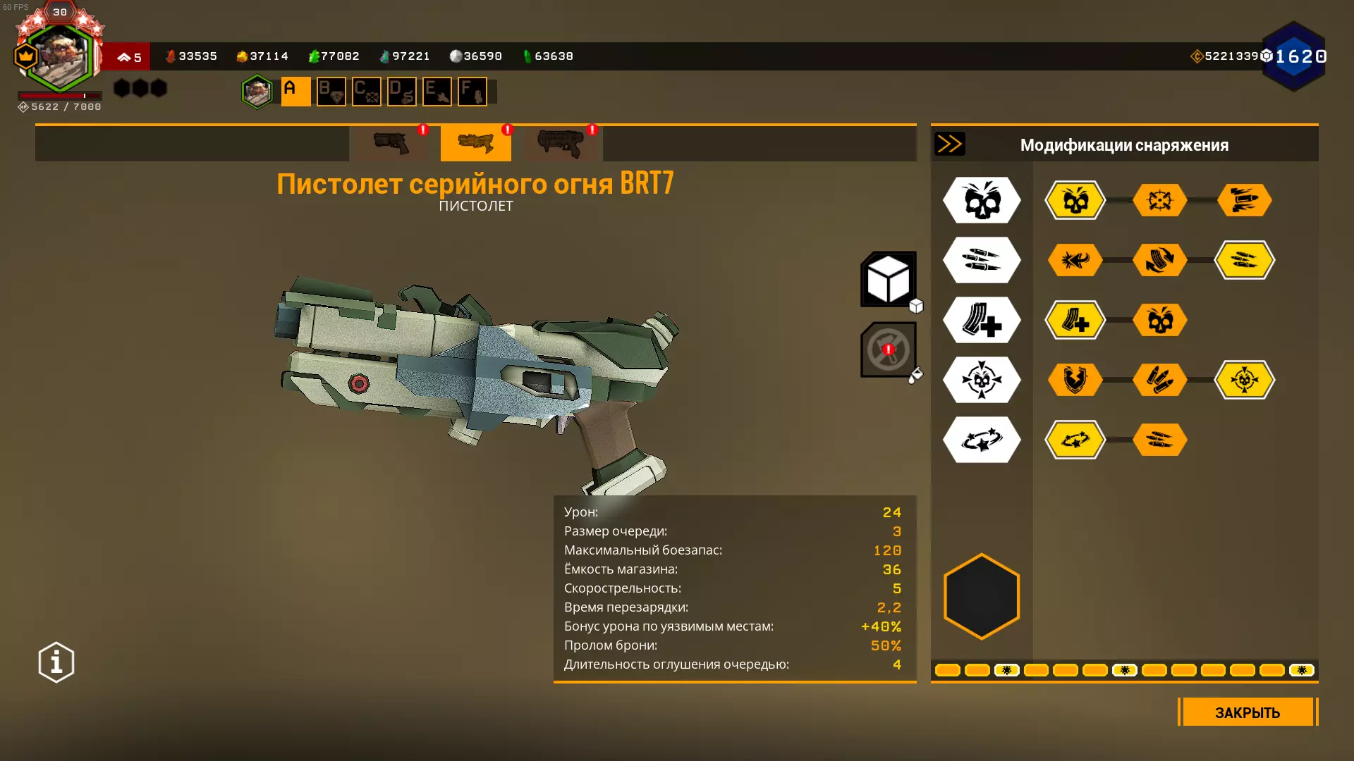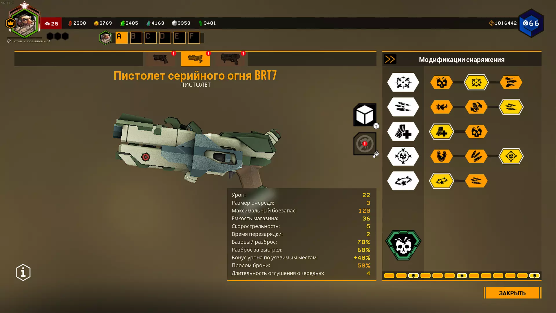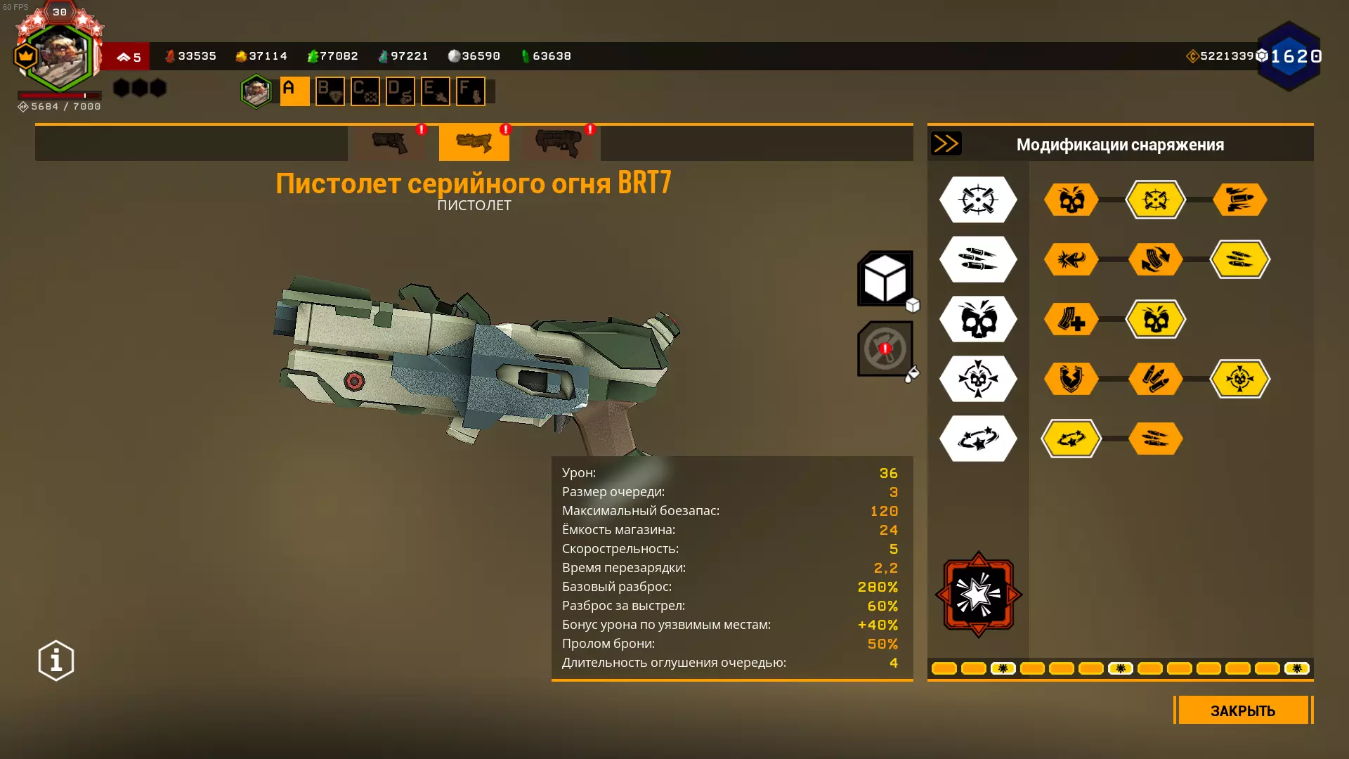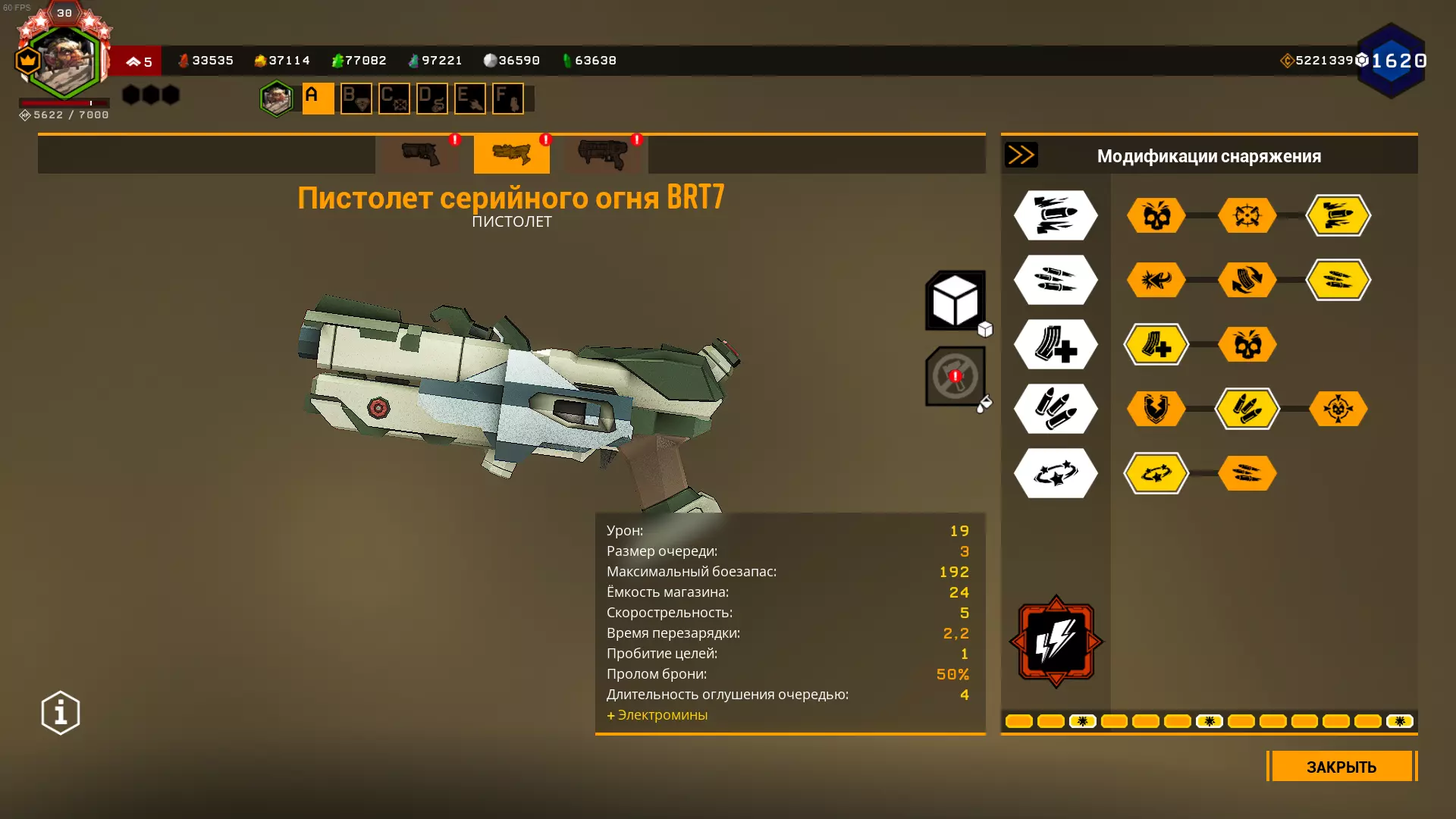 严重削弱的超频模块,表现甚至不如原版左轮手枪。超频能让左轮手枪的伤害提升一倍,同时还能提高基础精准度。但缺点也随之而来,而且数量不少:弹容量减少12发,后坐力极大,弹巢容量减少1发(模型也没改),还有0.5秒的换弹时间增加(这个不算太严重)。最大的缺点是巨大的后坐力和弹药减少,因此我们必须选择一项弹药强化。 在2级天赋选择减少后坐力,因为它能将射击散布降低一半。 在5级天赋选择神经毒素。装备5级神经毒素后,【普雷托】会在2个弹匣后死亡,【梅纳斯】1个弹匣就死,【马克特拉】则有几率被三发爆头击杀(如果触发神经毒素效果)。 我个人不推荐使用这个超频。BRT7连发手枪/BRT7连发枪 这是一把非常出色的枪手职业冲锋手枪,拥有极高的每秒伤害和稳定性。 我只是不明白为什么在深岩银河的俄语社区里,大家会觉得它很垃圾(深岩银河俄语Discord服务器除外)。我认为这是受到了一位知名深岩银河YouTuber观点的影响。 从射击机制来看,BRT7每次按下开火键会发射3发子弹。 我们将把BRT7配装成单体目标型。 不使用超频配件。