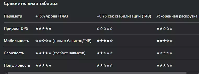 第四层: +15%伤害(完全稳定时)(T4A)——针对优先目标造成最大伤害的最佳选择。需要持续射击。伤害加成在22发子弹后激活;若有T1B提供的射速加成,则为21发子弹。 快速旋转(T4B)——新手快速加入战斗的不错选择。 +1秒稳定保持时间(T4C)——几乎无用。1秒不足以进行战术操作。