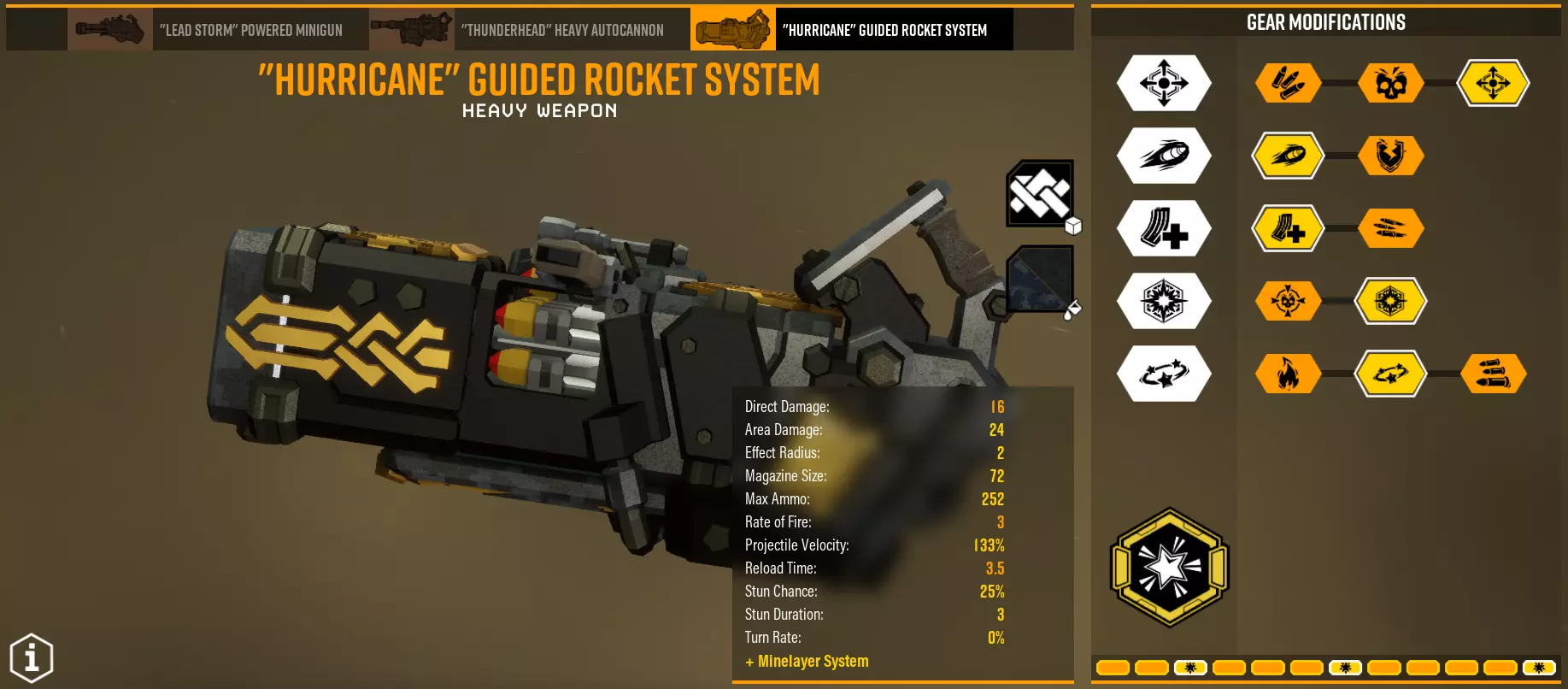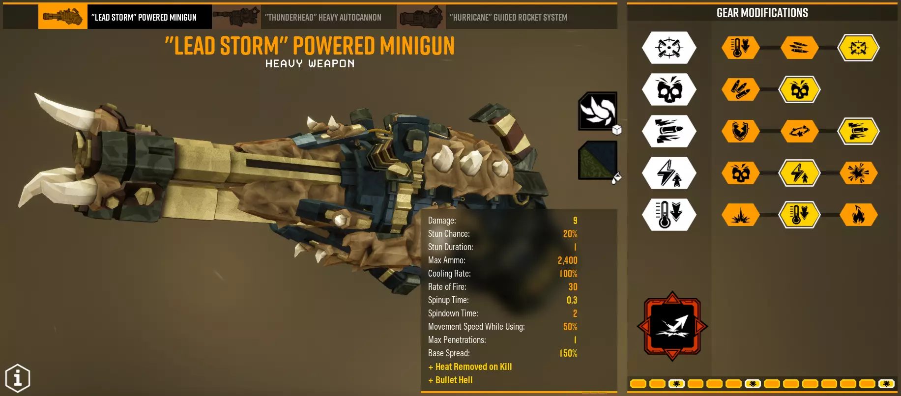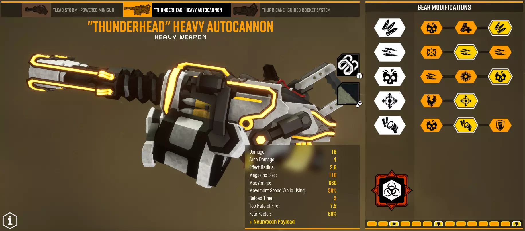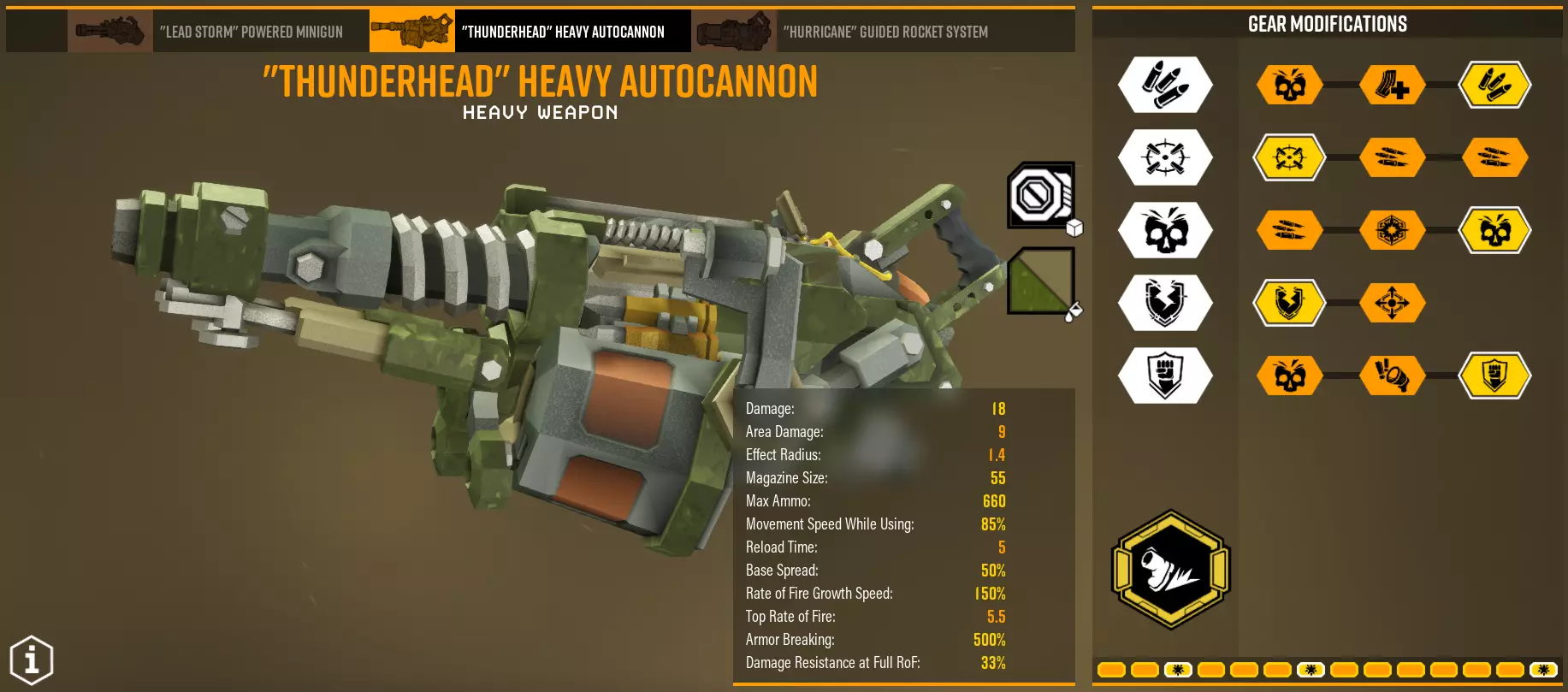 每个模块都取决于你的超频设置,尤其是T1。在第二梯队(T2),我们主要获取总伤害。第三梯队(T3)我建议几乎总是选择穿透,但“ стан”(可能指“ станок”,即机床/工作站)也不错。第四梯队(T4)的话,如果你追求操作便捷性就选稳定速度,如果你追求的就是伤害本身就选伤害。第五梯队(T5)同样取决于你的配装方案。 总的来说,如果不考虑超频,配装方案XX32X既高效又实用。事实:每2单位迷你枪弹药会发射1发子弹,因此实际弹药数量为统计数量的一半。 重型自动炮台【Thunderhead】 有趣、独特、好用、高效。总之就是非常强力。 装弹时间很长,但可以通过取消动画来缩短。几乎任何自动步枪的配置都可以从高稳定性调整为高射速,以充分发挥其 DPS(每秒伤害)而非整体性能。 配置一 - 标准突击 超频 - 地毯式轰炸