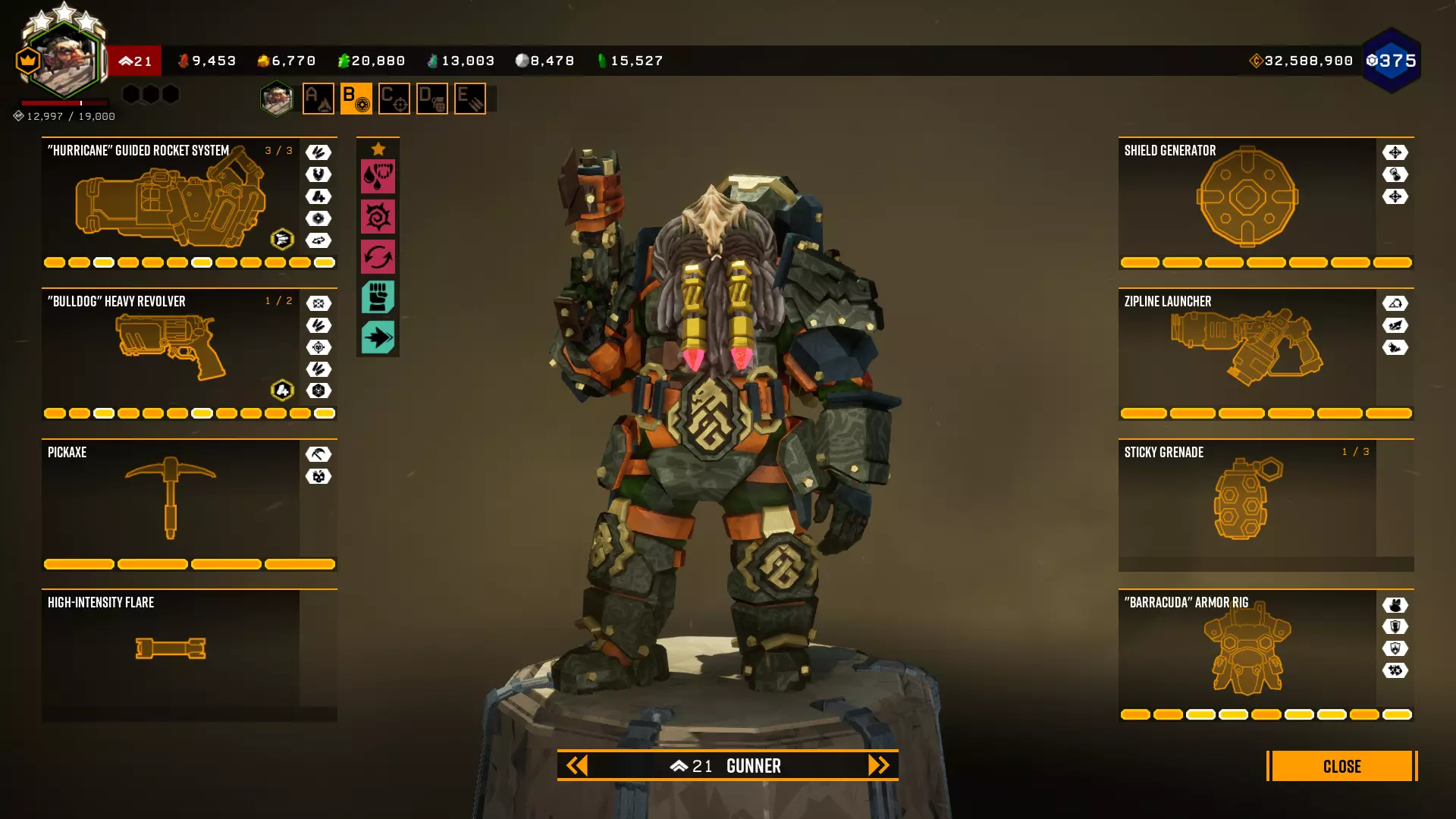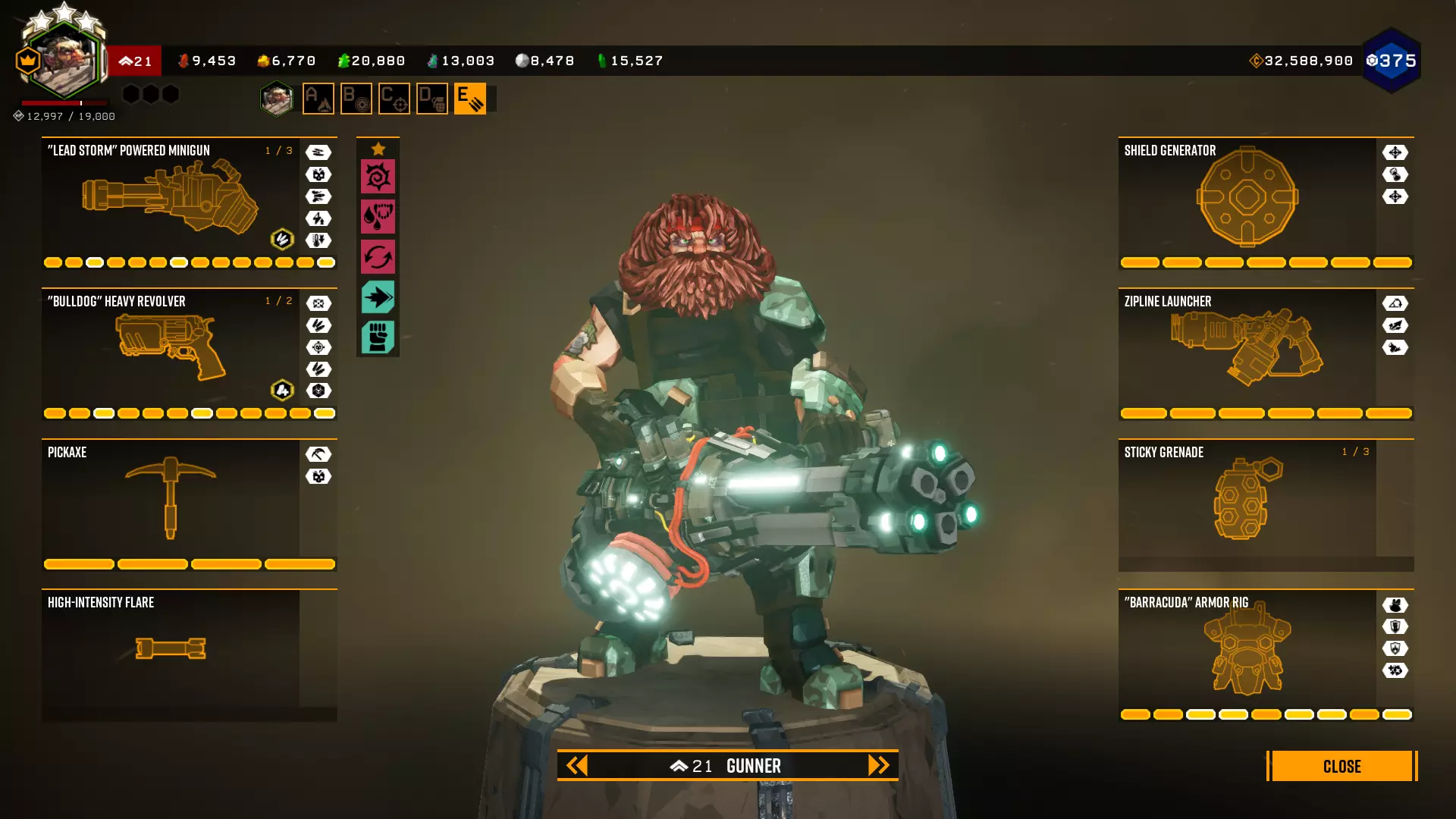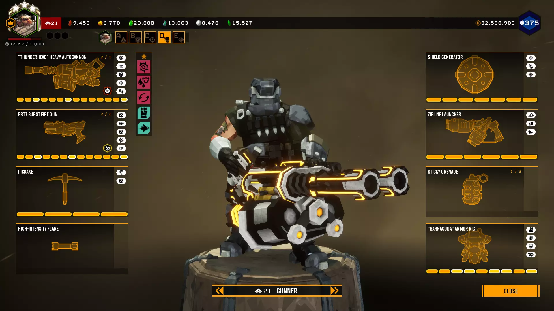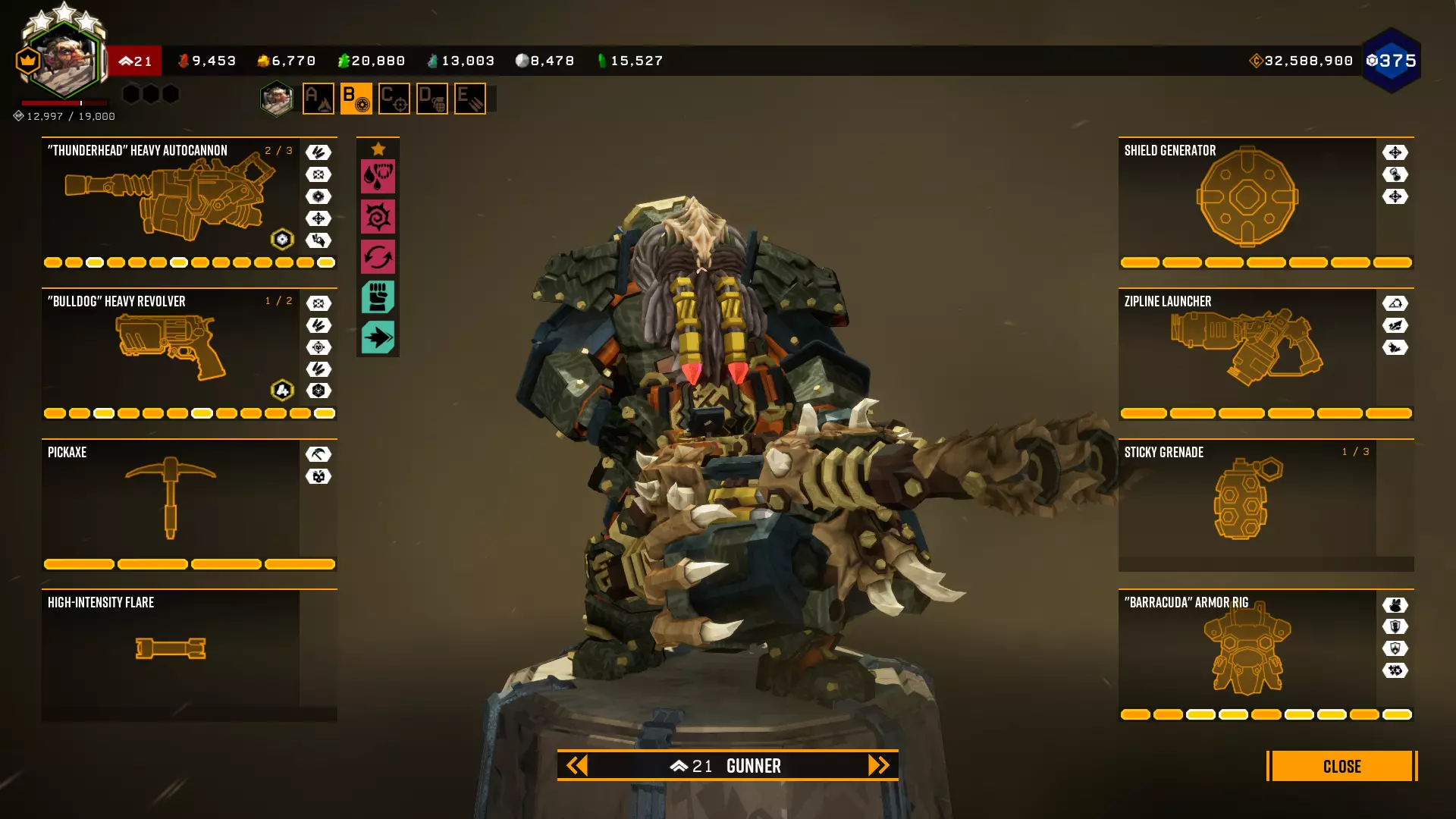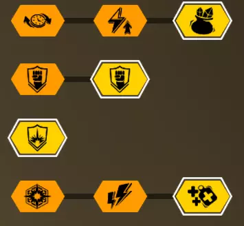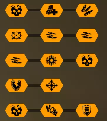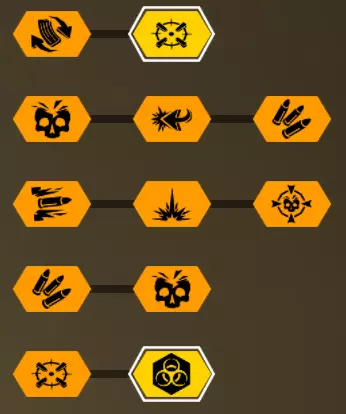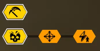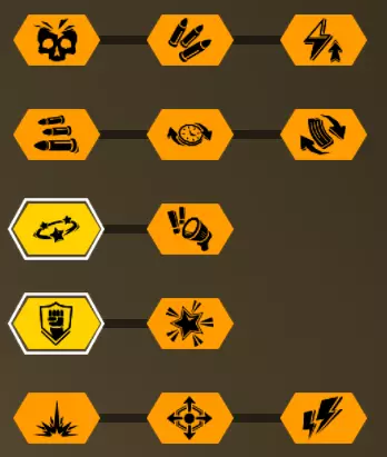 在第一个等级我选择+5背包容量,因为所有大型资源矿脉的资源量都差不多在45单位左右。 最后一个等级是最重要的升级。前两个模块几乎没什么作用,更不用说5点危险等级了。第一个模块(冲击波)的作用是让对付水母和绿色群体生物变得轻而易举,因为当护盾破裂时,它们会在较大范围内被瞬间消灭。而6秒的无敌时间能拯救任务。在6秒内可以:扶起队友、使用资源包、从任意地方安然坠落等等。很多人忘记了在这6秒内,就算有10个胖子朝你开枪,你也不会有事。尽管用你最强的武器朝自己脚下射击。 技能 我玩枪手时的主要技能组合如下: