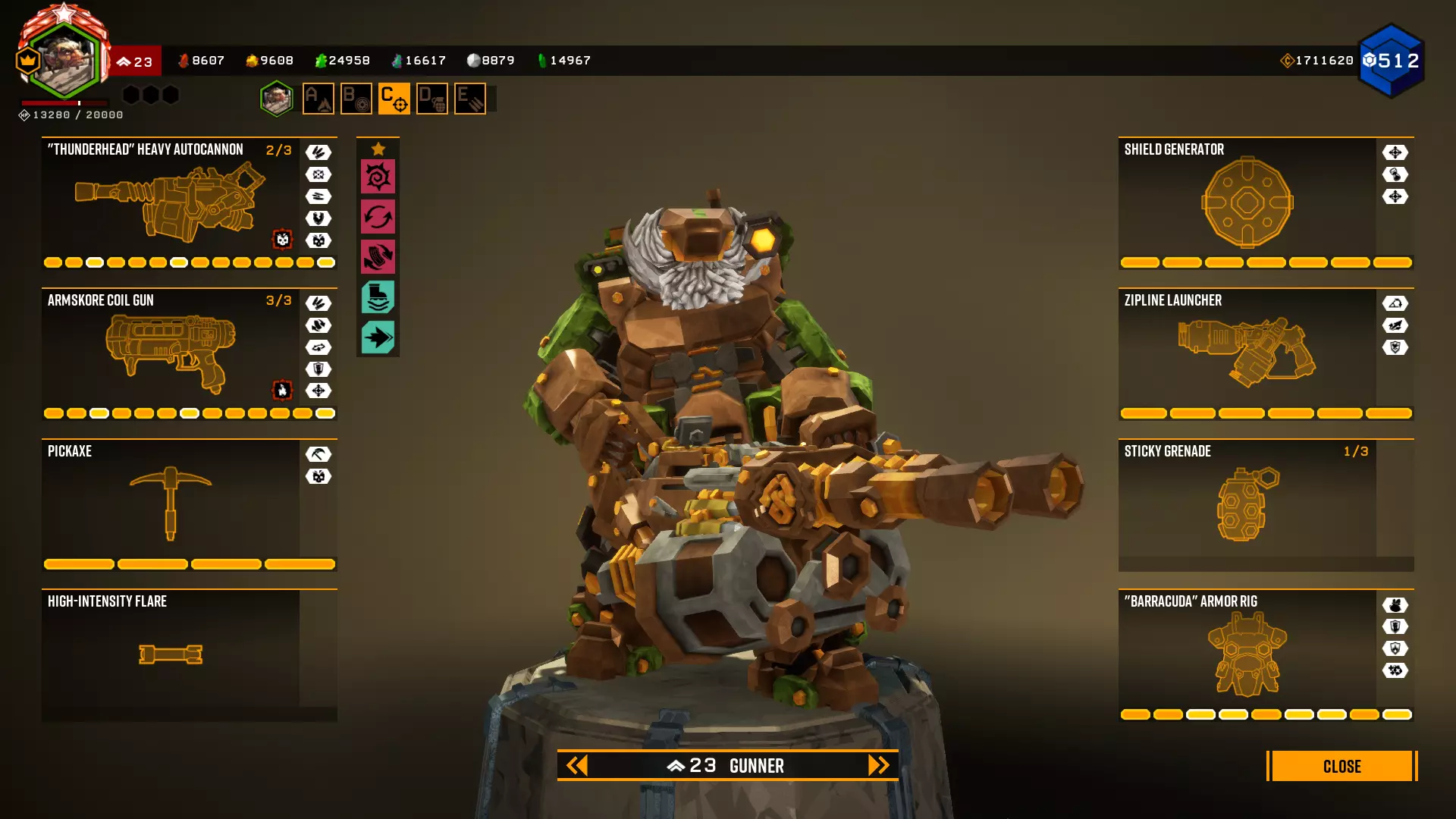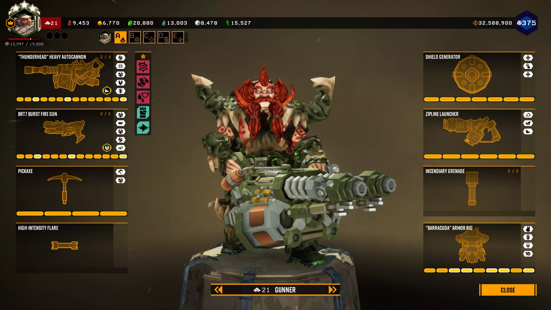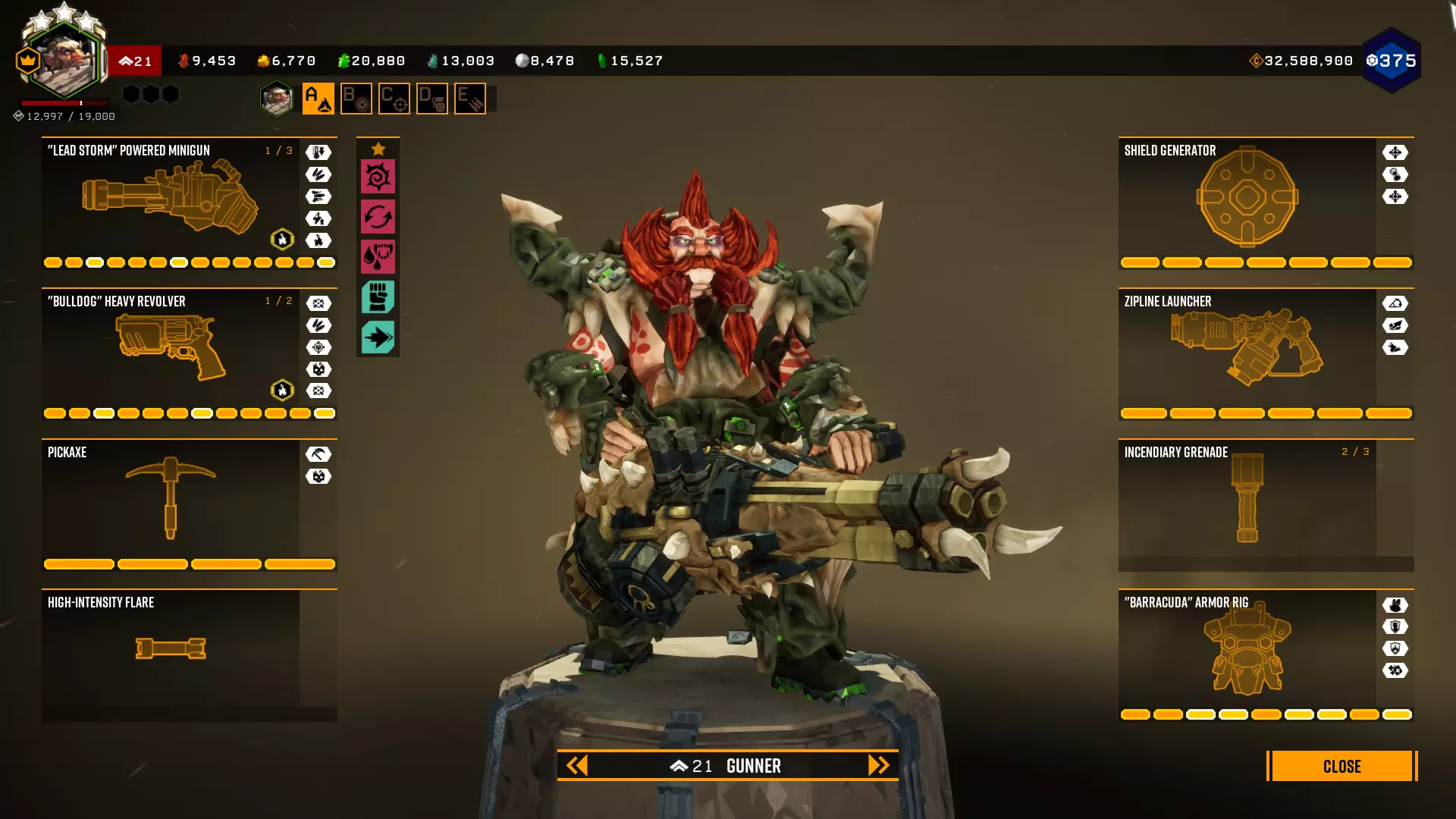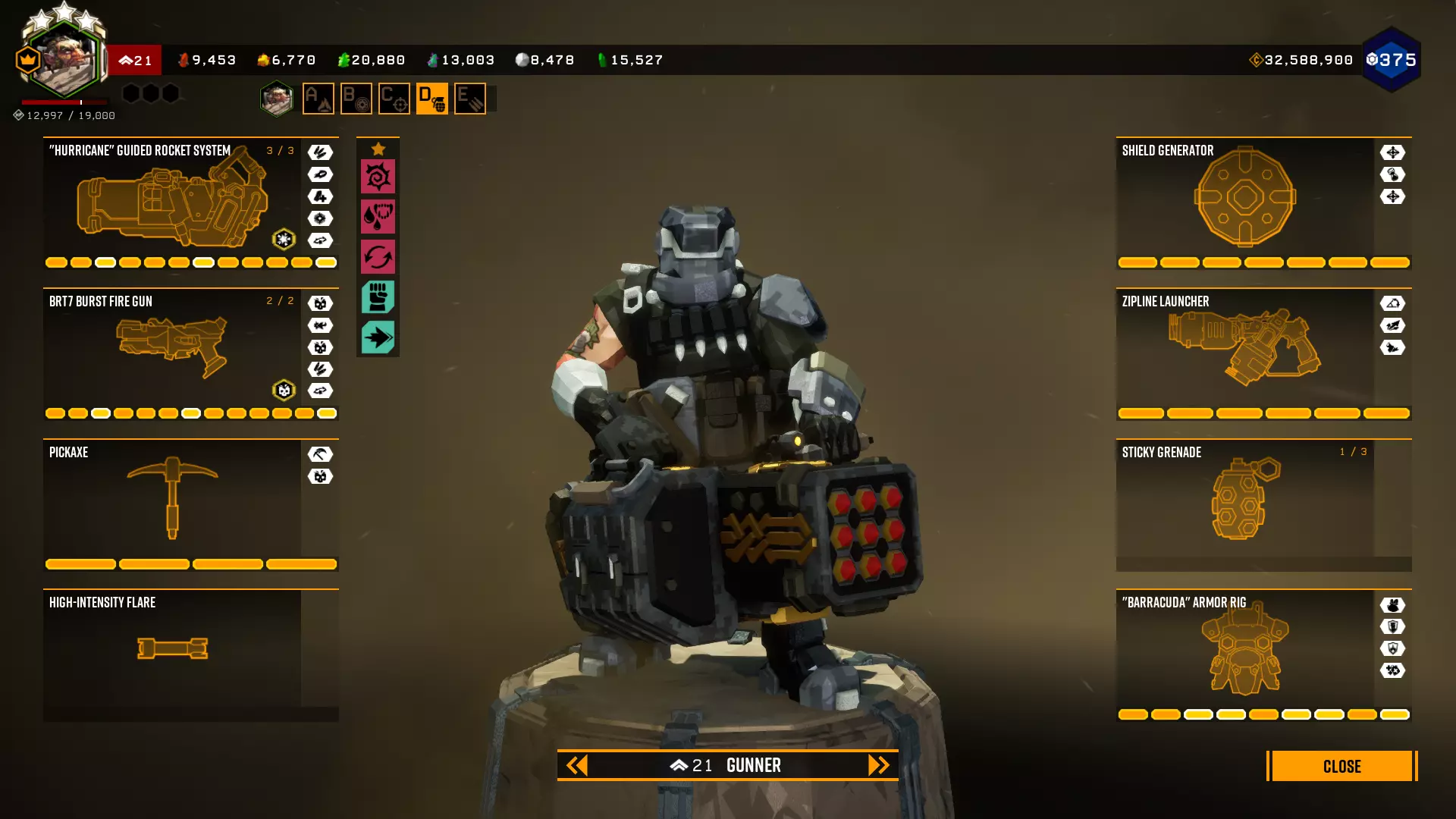 在第一个等级我选择+5背包容量,因为所有大型资源矿脉的资源量都差不多在45单位左右。 最后一个等级是最重要的升级。前两个模块几乎没什么作用,更不用说5点危险等级了。第一个模块(冲击波)的作用是让对付水母和绿色群体生物变得轻而易举,因为当护盾破裂时,它们会在较大范围内被瞬间消灭。而6秒的无敌时间能拯救任务。在6秒内可以:扶起队友、使用资源包、从任意地方安然坠落等等。很多人忘记了在这6秒内,就算有10个胖子朝你开枪,你也不会有事。尽管用你最强的武器朝自己脚下射击。 技能 我玩枪手时的主要技能组合如下: