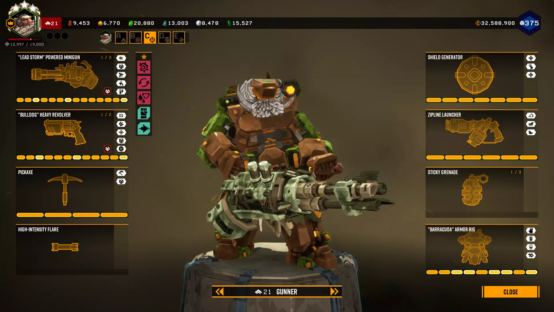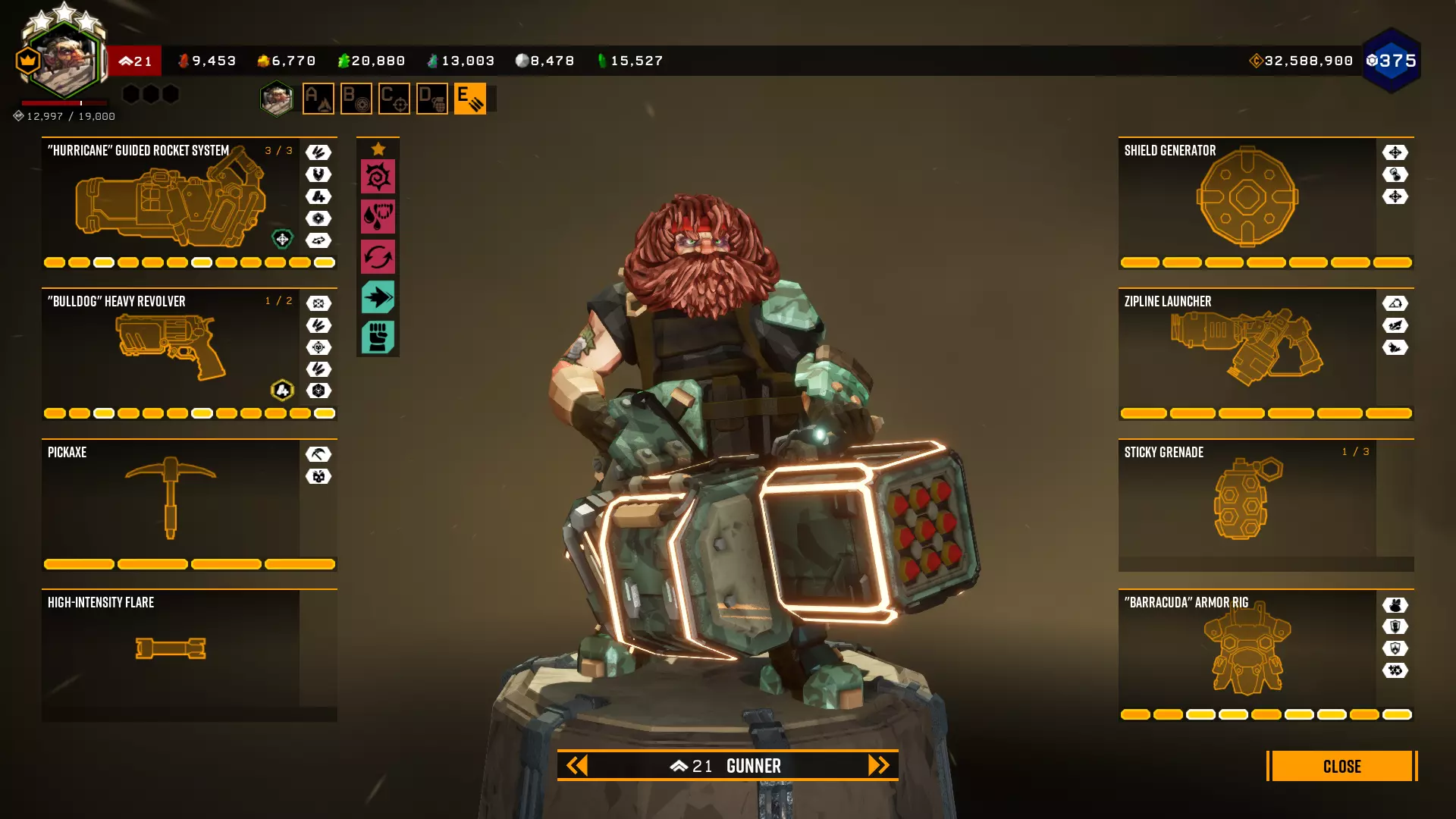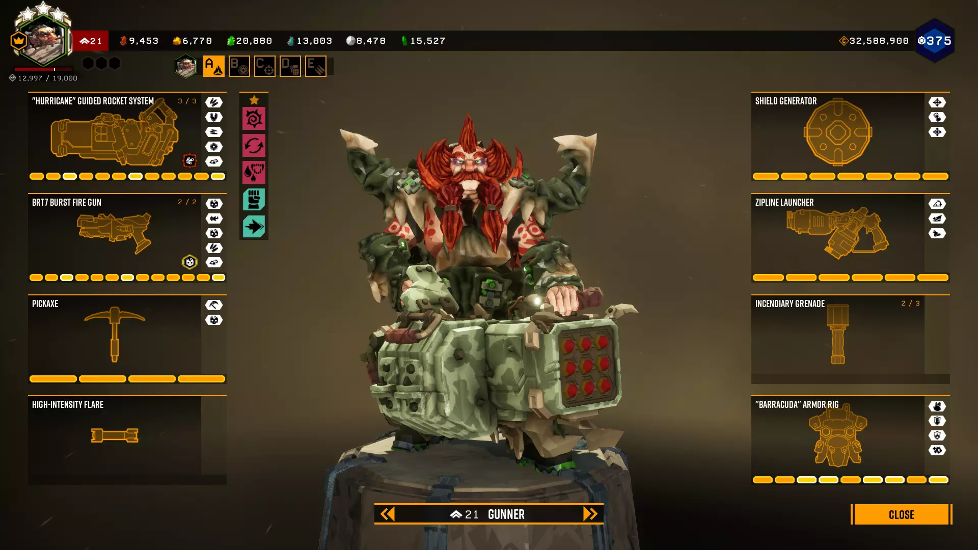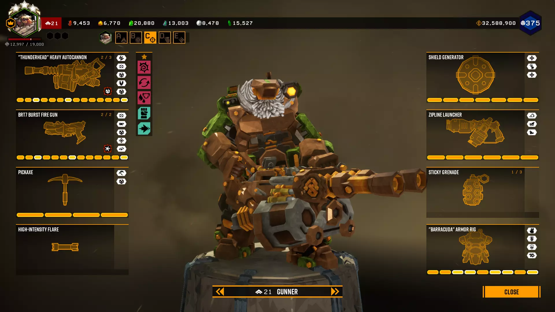 在第一个等级我选择+5背包容量,因为所有大型资源矿脉的资源量都差不多在45单位左右。 最后一个等级是最重要的升级。前两个模块几乎没什么作用,更不用说5点危险等级了。第一个模块(冲击波)的作用是让对付水母和绿色群体生物变得轻而易举,因为当护盾破裂时,它们会在较大范围内被瞬间消灭。而6秒的无敌时间能拯救任务。在6秒内可以:扶起队友、使用资源包、从任意地方安然坠落等等。很多人忘记了在这6秒内,就算有10个胖子朝你开枪,你也不会有事。尽管用你最强的武器朝自己脚下射击。 技能 我玩枪手时的主要技能组合如下: