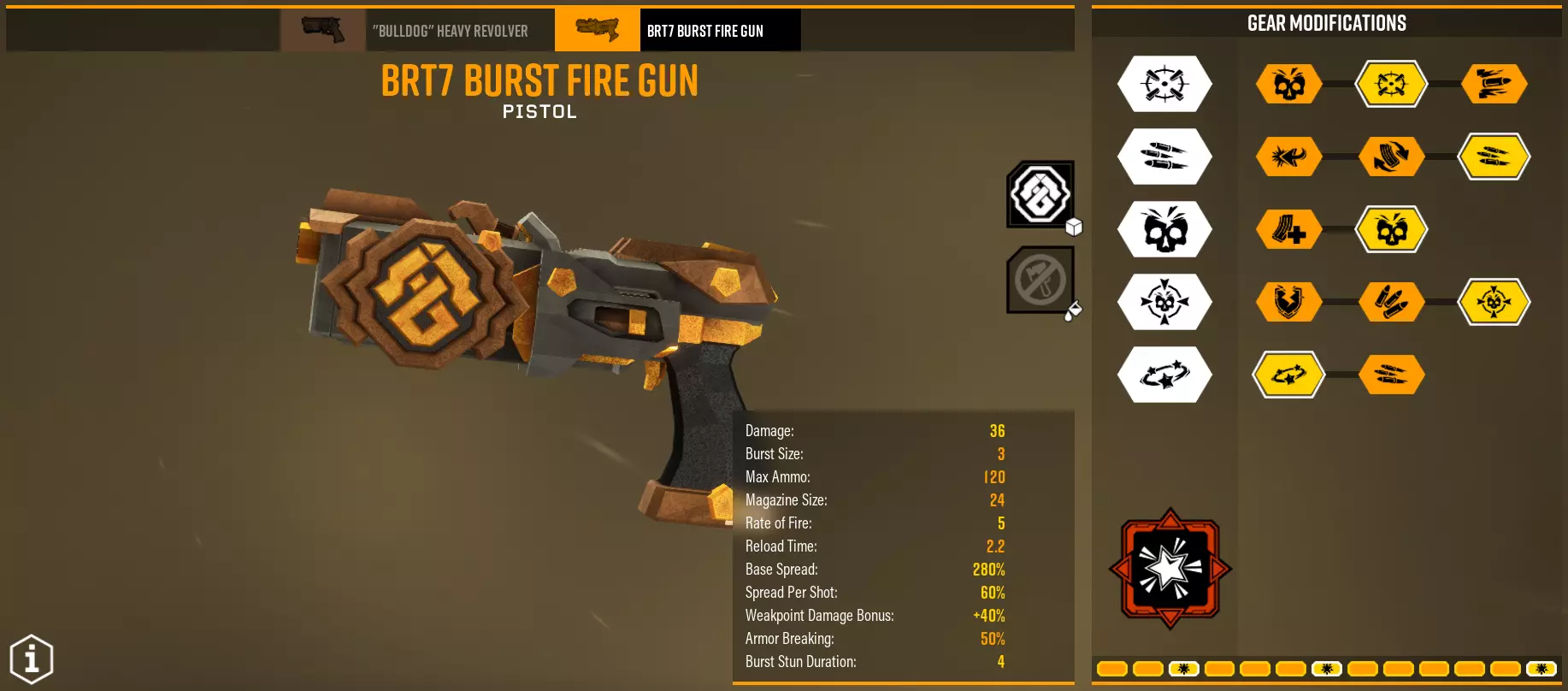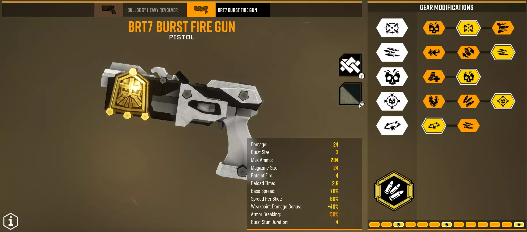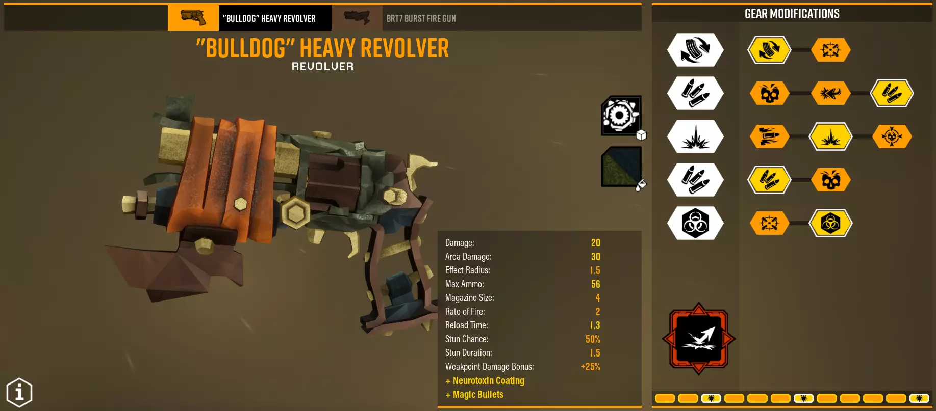 总体而言,你的任务是造成60点弱点伤害,如果是单体目标的话,其他情况已在上方说明。如果你选择爆炸伤害,保持30/30的伤害比例,没有必要为大量子弹增加5点直接伤害。毒素通常作为额外伤害,【Volatile bullets】除外。 BRT7手枪 它与左轮手枪有何不同?能够连发射击,在最后一个弹匣拥有极其强大的稳定性,持续作战能力和总伤害更高。版本1 - 战利品袋让我兴奋 超频 - 实验回合