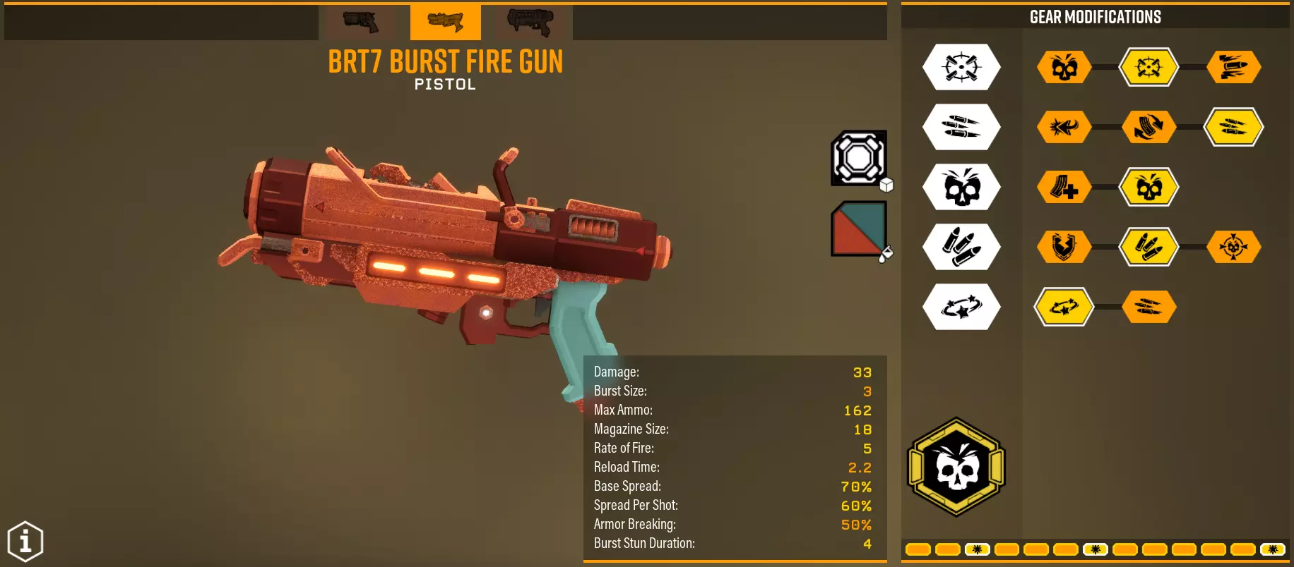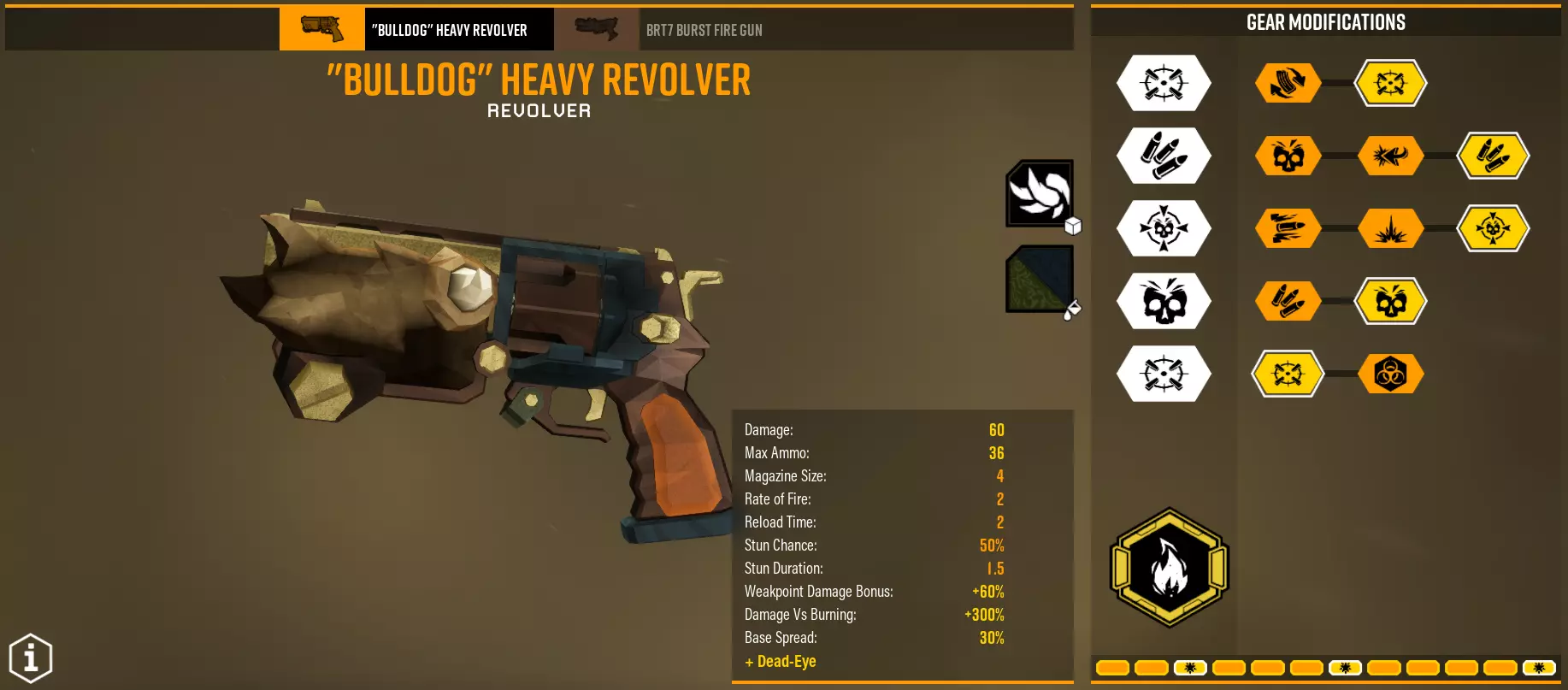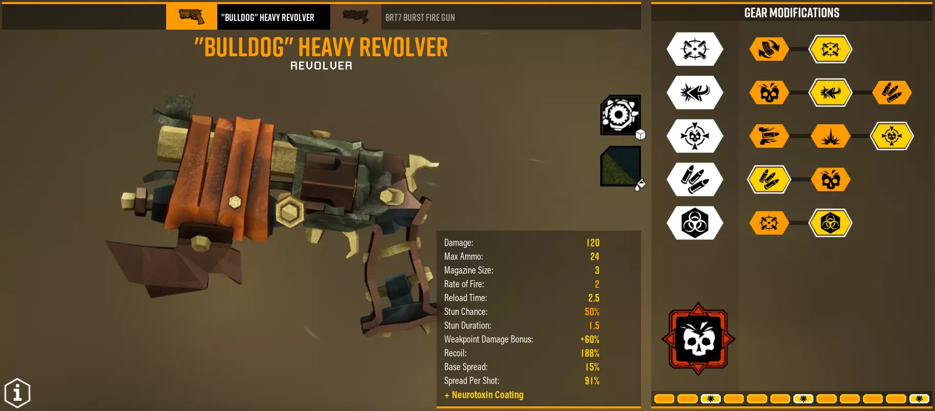 总体而言,你的任务是造成60点弱点伤害,如果是单体目标的话,其他情况已在上方说明。如果你选择爆炸伤害,保持30/30的伤害比例,没有必要为大量子弹增加5点直接伤害。毒素通常作为额外伤害,【Volatile bullets】除外。 BRT7手枪 它与左轮手枪有何不同?能够连发射击,在最后一个弹匣拥有极其强大的稳定性,持续作战能力和总伤害更高。版本1 - 战利品袋让我兴奋 超频 - 实验回合