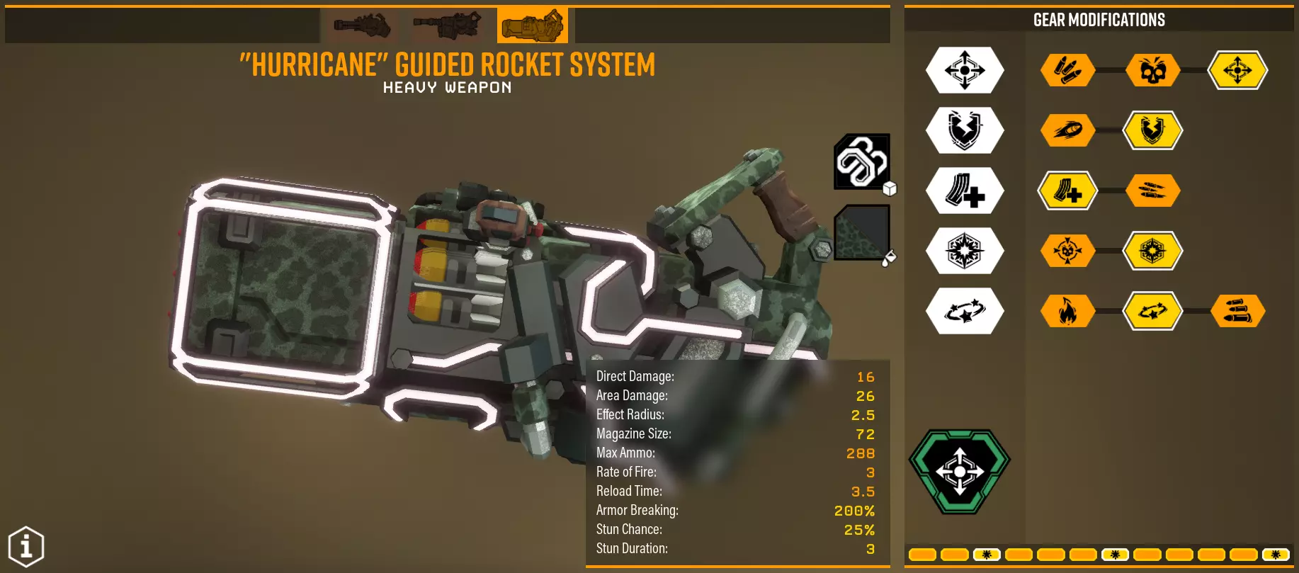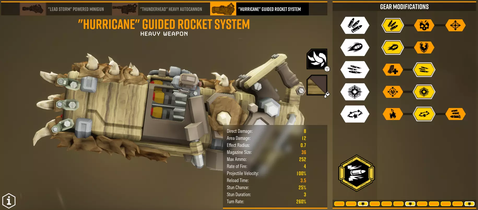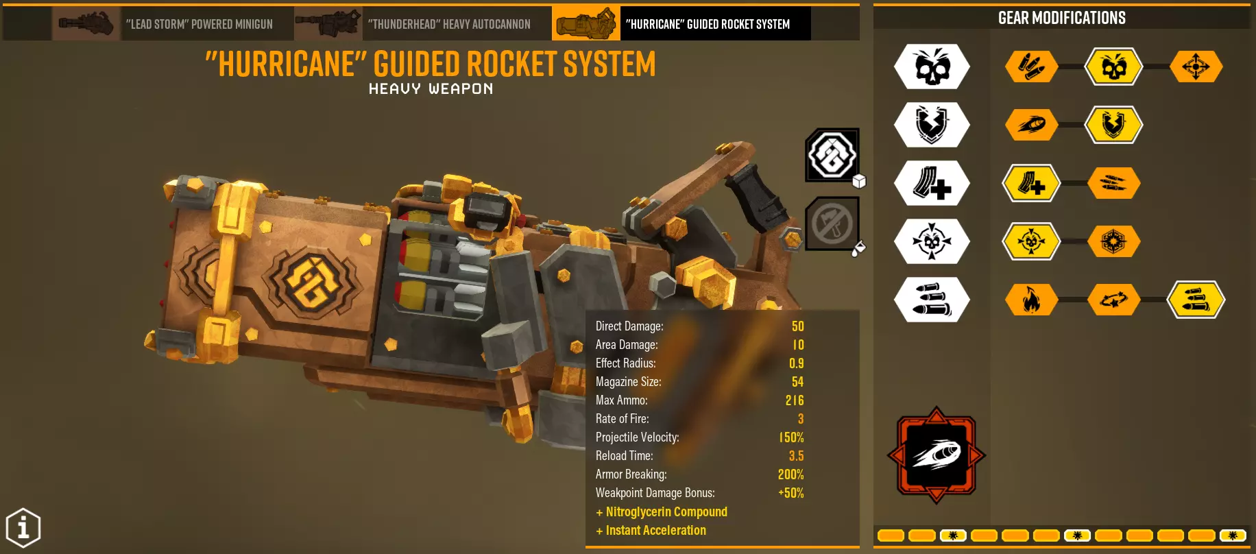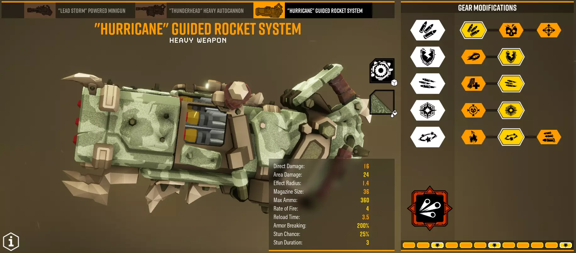 这可以说是我最喜欢的。非常棒,别觉得它不好。它会根据 salvo中装填的火箭数量,为每枚火箭增加额外伤害。mods保持不变。对于大多数mods的作用都很明显,而在T3中,射速会影响salvo的装填速度,所以一定要选这个。 对付不同类型的地面敌人时,salvo发射大约4枚火箭,而在preorian时,装填全部9枚火箭,然后用手枪补刀。对抗其他敌人时使用副武器。每枚火箭在完全充能状态下增加4/4点伤害。其他超频方面:Overtuned Feed Mechanism