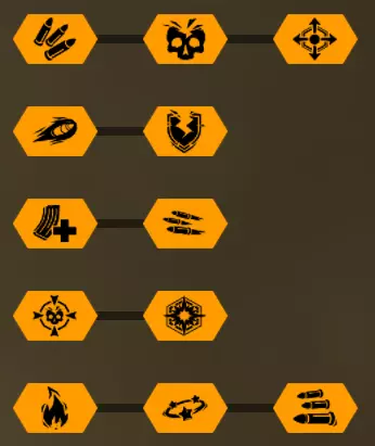 很明显,这是纯单体目标,所以要相应地进行配装。在这种情况下,弹药甚至比平时更重要。增加散射是为了更容易触发暴击。三阶的4点额外伤害,尤其是对五阶的加成有帮助。破甲由于范围效果无用,且为了应对甲壳类敌人的护甲而选择。最后是五阶——额外伤害。在这套配装中,这个加成很重要,因为它已经相当可观:3点直接额外伤害和0.9的范围伤害。玩法很简单:瞄准弱点,像移动炮塔一样行动,击倒禁卫、克隆兵之类的敌人。不过,每秒伤害有点拉胯。 为了提升每秒伤害,可以专注于2和3级的射速,这样能带来相当不错的效果。