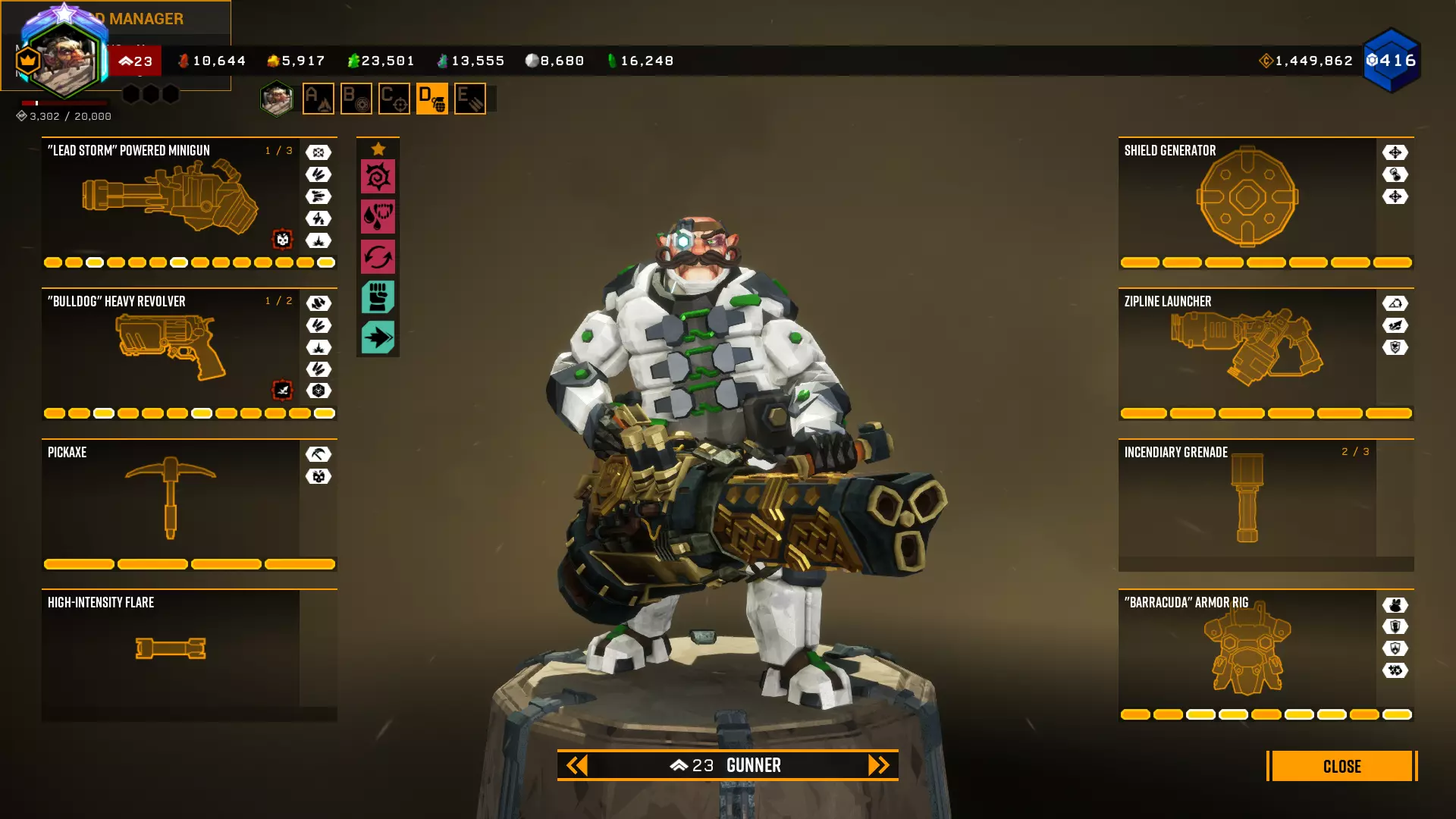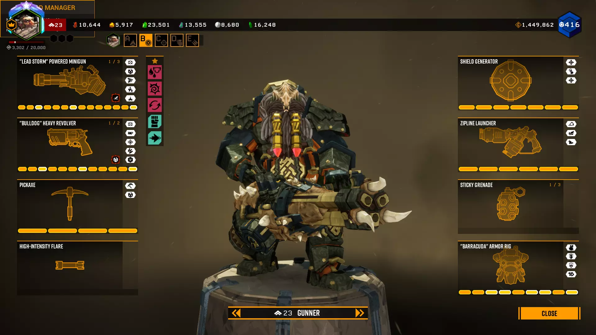 被动技能: 尖刺 - 极其有用的专长。没有什么比因为没装备它而死于虫潮和水母更糟糕的了。它能让小规模战斗变得轻而易举,对较大规模的集群敌人也有很大帮助。 弹药专家(Resaplaer) - 非常有用的专长,能更快在钢铁意志状态下补充弹药,在5级危险等级时通过弹药补充获得更多至关重要的生命值,还能为所有武器重新装弹。吸血鬼也是一个非常好的生命值回复专长。在任务过程中,仅凭吸血鬼专长你就能把生命值恢复满。它和我们增加伤害的镐子搭配效果很好:击杀越多敌人,生命值恢复就越多。在枪手职业上,我不会用其他专长来替换它。如果不想用吸血鬼,你可以选择抗性专长或【甜食爱好者】,也可以在不卸下【技能重置器】的情况下选用【时刻准备着】。 主动专长: 【冲刺】——游戏中最优秀的专长,无可替代。我认为这应该是一项基础能力,而非专长。它能提供极高的生存能力和机动性,这意味着更高的击杀潜力。更何况它还能无视任何移动阻碍。别听那些说你太急躁的人。清理完洞穴就意味着该继续前进了。不是你逃跑了,而是他们落后了。当你在任务结束时展示你的数据统计,他们就无话可说了。你也会是第一个到达掉落物的人。钢铁意志(Iron Will)是任务救星。很长一段时间我都不想在所有地方都装备它,而是用其他技能替代,但它的实用性毋庸置疑。整整12秒的时间可以横扫周围一切。特别是吸血鬼技能,是为了在该技能结束后不会再次倒地死亡,而是保持存活状态。 驯兽大师(Повелитель зверей)是最适合击杀的技能。史蒂夫是一个拥有大量生命值和伤害的移动链锯,无需任何帮助就能轻松干掉任何压迫者,还能吸引大量虫子,否则这些虫子就会来攻击你们。如果可以,一定要招募卫兵。他的伤害比电锯手略低,但生命值极高。 战地医生——很明显,这个技能完全是团队向的。说实话,它只有和钢铁意志搭配使用才有用,而不是取代钢铁意志。因为在钢铁意志中,你本来就能平稳拉起队友,而提升拉起速度的增益效果并不明显。主动技能会被队友身上的钢铁意志所取代。 狂战士——我会搭配吸血装备来恢复生命值,减少弹药消耗。 能量链接——在列表中是最没用的,可能只比狂战士好一点。给队友施加30秒的增益让他承受伤害,这还挺有意思的。只有该技能的持有者本身完全得不到任何收益。至少应该让持有者能恢复满护盾才对。这个被动技能完全不起眼。好在冷却时间只有2分钟。 悬浮靴(原词:Hover boots)是个提升机动性的优秀技能。从任何高度坠落都不会受到一点伤害?冲刺时像子弹一样飞出去并安然出水?在空中悬浮3.5秒?可以想到的用法非常多。我的配装方案 本部分很少更新且可能不是最新内容,因为我经常调整自己的配装方案并推荐给大家。