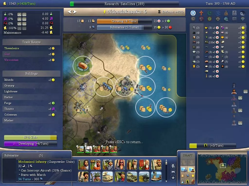 上面这个城市没有很多产出锤子的地块。你可以看到海洋地块出现了。征召。海洋地块不产出锤子。(我没有在这个锤子产量低的城市建造工厂。我征服了这个城市。)