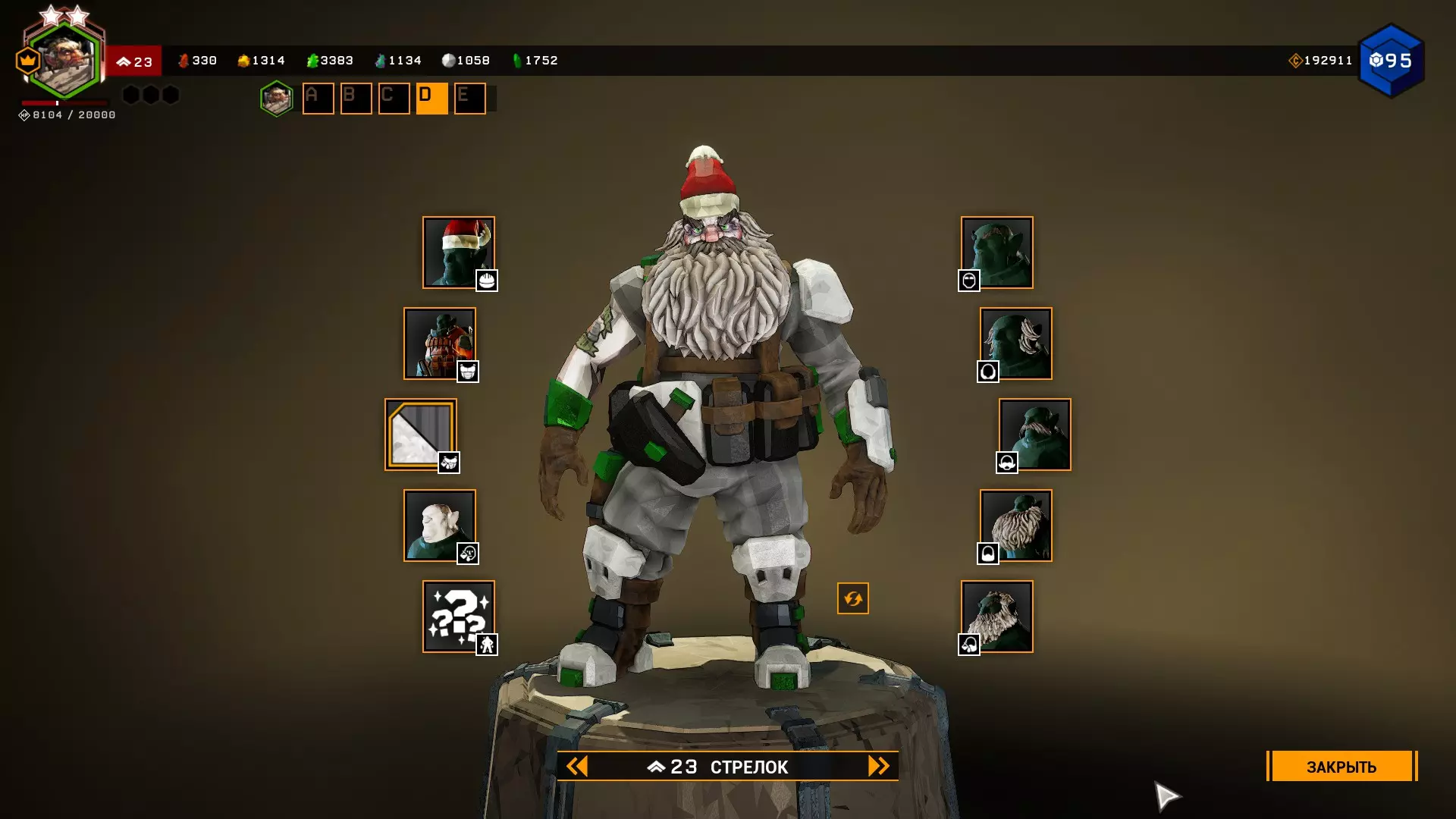 战斗圣诞老人 职业 - 射手 头部装备 - 尤勒节袜子 护甲 - 工作服 护甲颜色 - 皇家壁垒 皮肤颜色 - 苍白 眉毛 - 毛茸茸的毛毛虫 鬓角 - 双层楼 胡子 - 牢骚鬼 胡须 - 大洋葱 头发颜色 - 古老