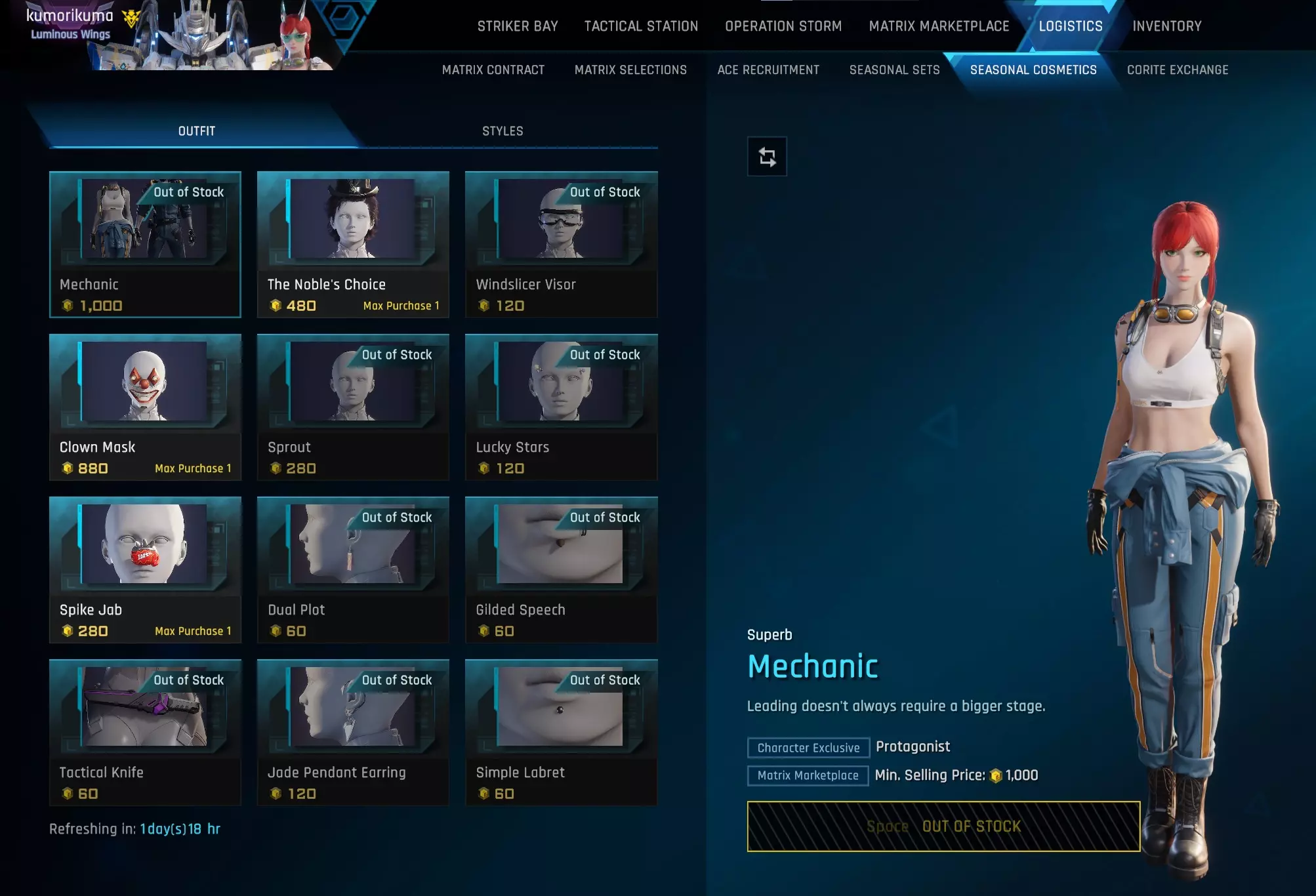 如果你已经打开了它们,没关系!你可以查看【从玛什马克获取科里特】部分。 从季节性 cosmetics 制作科里特 一旦你有了启动资金,就可以在商店里转售你的季节性 cosmetics。每位玩家每周都有自己的商店,这种限定性质意味着你可以将大部分此类物品卖个好价钱,尤其是像【机械师】和【运动员】这样的套装。 【STYLES】标签页中的任何物品都不能出售!只能在【OUTFIT】标签页中出售。