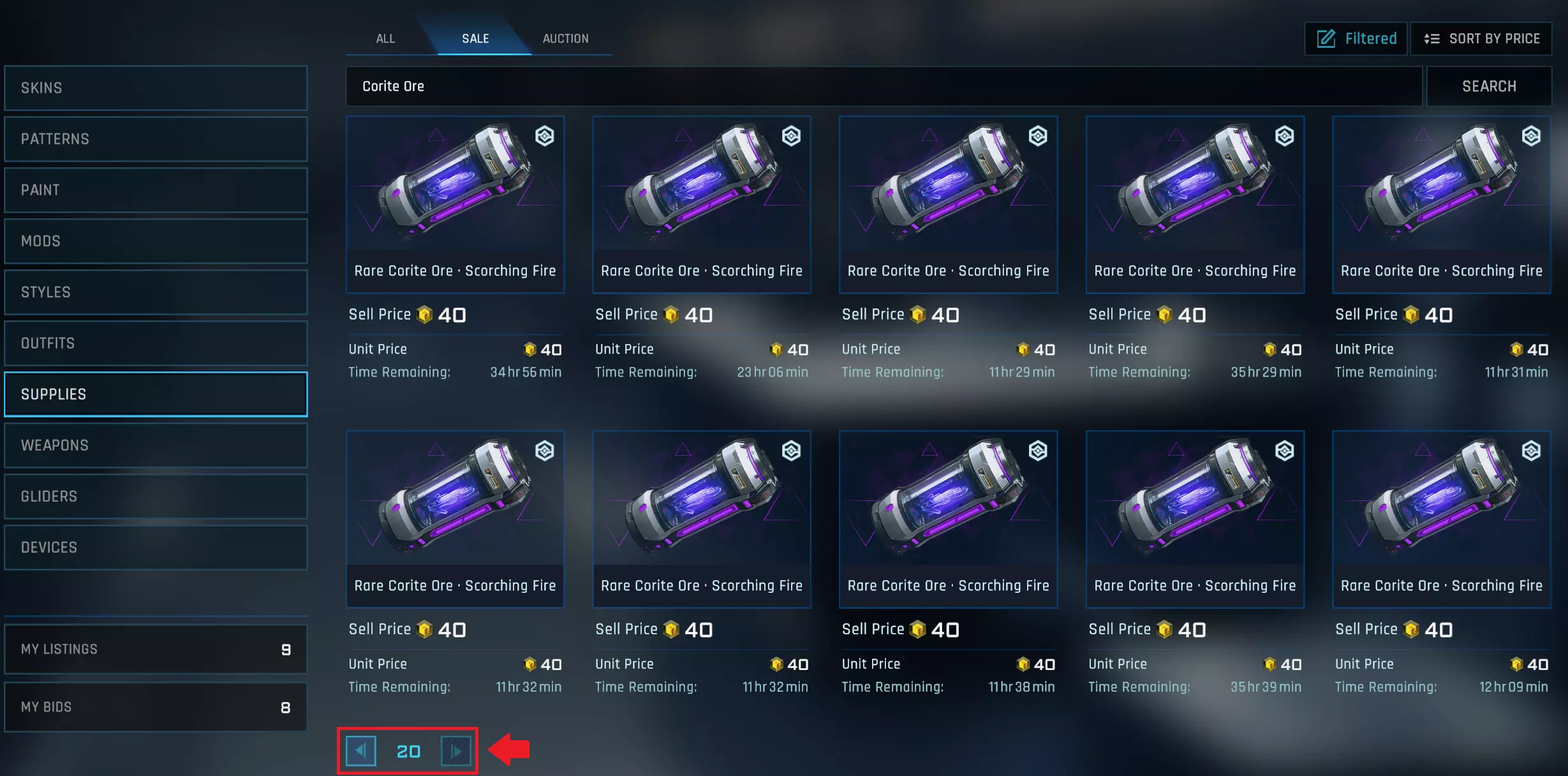 搜索结果仅显示前20页!这意味着,当有人搜索想要购买的物品(例如紫色科莱特矿石)时,可能只能看到20个价格最低的商品。由于所有人都以最低价格上架,所以如果你想真正有机会卖出科莱特矿石,就需要每次只上架1个,最多2个。