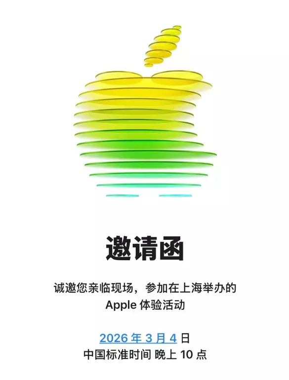 快科技2月16日消息,今日, 苹果宣布将于美东时间3月4日上午9点在纽约、伦敦和上海举办一场特别的Apple体验活动。 目前,苹果已向媒体发出邀请函, 其中上海场时间为3月4日晚上10点。