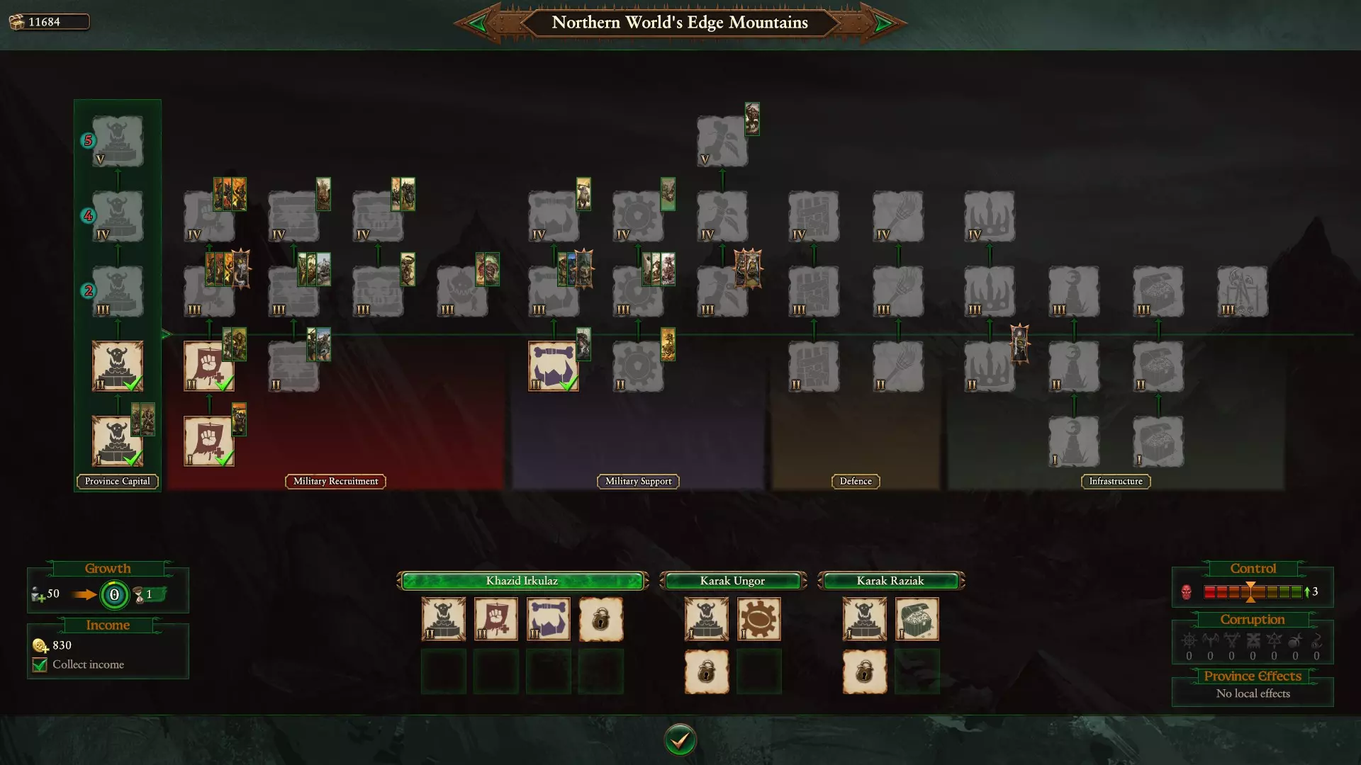 这一点可能不会立即被你注意到,但你拥有的省份定居点数量会增加额外的招募容量。这使得快速组建大规模军队变得容易得多。 要招募所有单位,共需建造7种建筑,其中只有1种可以在小型定居点建造。你很可能需要第二个省份才能完全建造所有军事建筑,同时仍能保持收入。 游戏中有一种兵营可以训练近战单位和远程单位,另一种可以训练炮兵和战车单位,这对玩家有所帮助。 3级单位略显不足,但4级单位几乎包含了你可能需要的一切。只有【 rogue idol】在5级。基础设施包含以下内容: - 英雄(地精大头目)招募、英雄招募等级及容量;控制力、腐败降低、全派系领主招募等级+1 - 增长和伤亡补充率 - 收入 - 战役移动范围;战后和劫掠收入;伏击成功率提升(行省);洗劫和掠夺收入+2%(全派系) 这些设定相当有趣,尤其是能获得更多全派系收入时。 研究系统同样强大。不仅可以强化大多数低阶和高阶部队,还能额外解锁2位领主,他们无疑能为特定的军队组合提供更多多样性。《全面战争:战锤3》不朽帝国 阿扎格-绿皮战役概述、指南与后续思考(续) 领主、技能、军队组成: - 阿扎格拥有一些不错的战役增益,一些酷炫的独特法术,包括死亡之风,以及兽人巨汉、兽人骑兵的整体升级。 - 红线技能是游戏中最出色的技能之一,不仅在于其对单位的组织方式,还在于它为这些单位提供的升级。由于选择某些技能后单位的战斗能力会大幅提升,你可以获得多种单位。