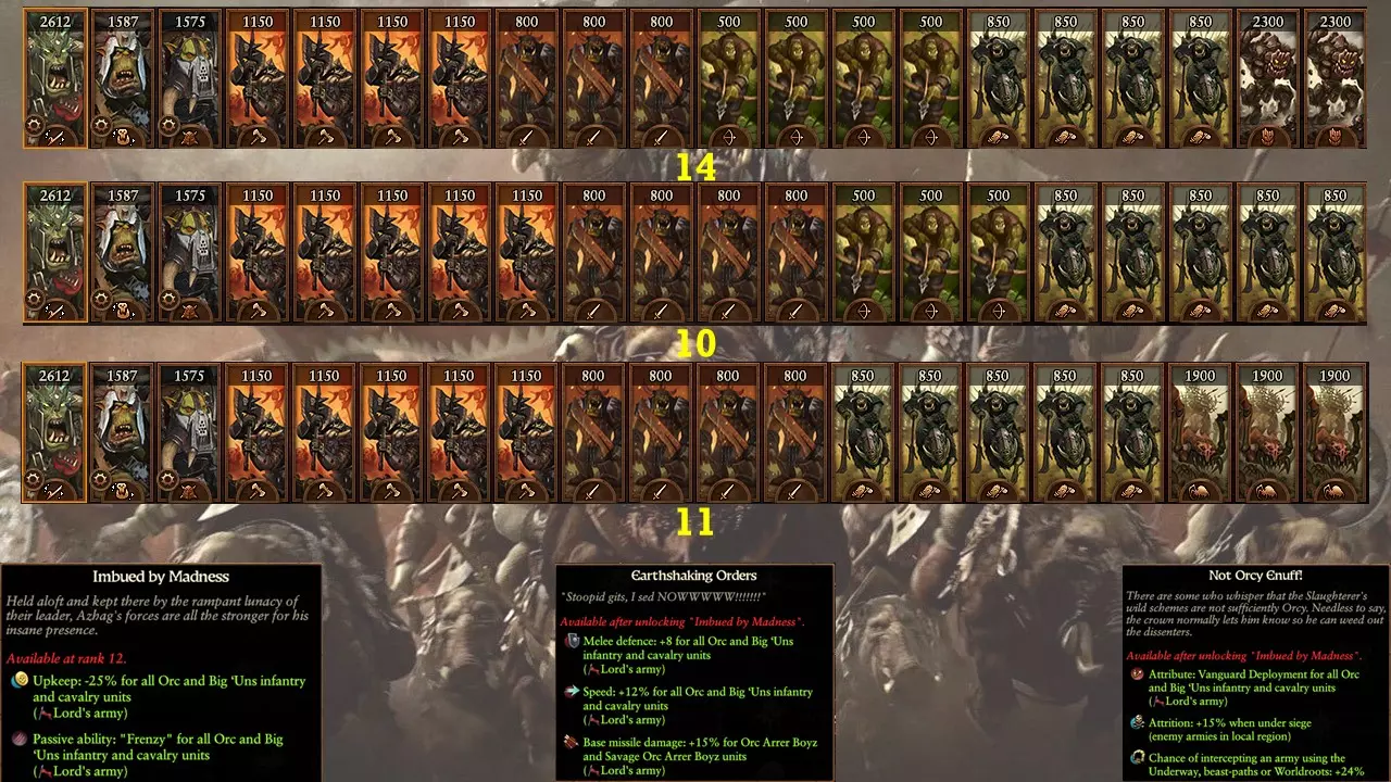 - 蓝线有维护费减免,但没有补充。有大量与劫掠、洗劫、掠夺相关的加成,如果你喜欢这种玩法,会很有帮助。 - 黑兽人英雄可为兽人单位提供补充,女巫则提供整体补充。两者都可以使用,也能为你提供一些不错的部队补充选择。 关于军队(见下图): - 阿扎格能对特定单位进行升级,赋予它们速度、狂怒、先锋部署等能力。这意味着这些单位会变得更加有用,非常值得编入军队。下图所示的军队正是利用这一点打造了坚实的前线,能以最快速度冲向敌人,并在接战时造成巨大伤害。非常适合伏击。