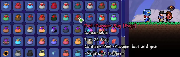 描述:添加了可掉落本模组材料和装备的袋子。击杀怪物可获得袋子。为了升级袋子及其内容物,您需要在游戏过程中依次击杀所有 Boss。此外,本模组还添加了两名 NPC,他们会出售药水,这些药水能在一定时间内降低袋子的品级(价值)。 截图: