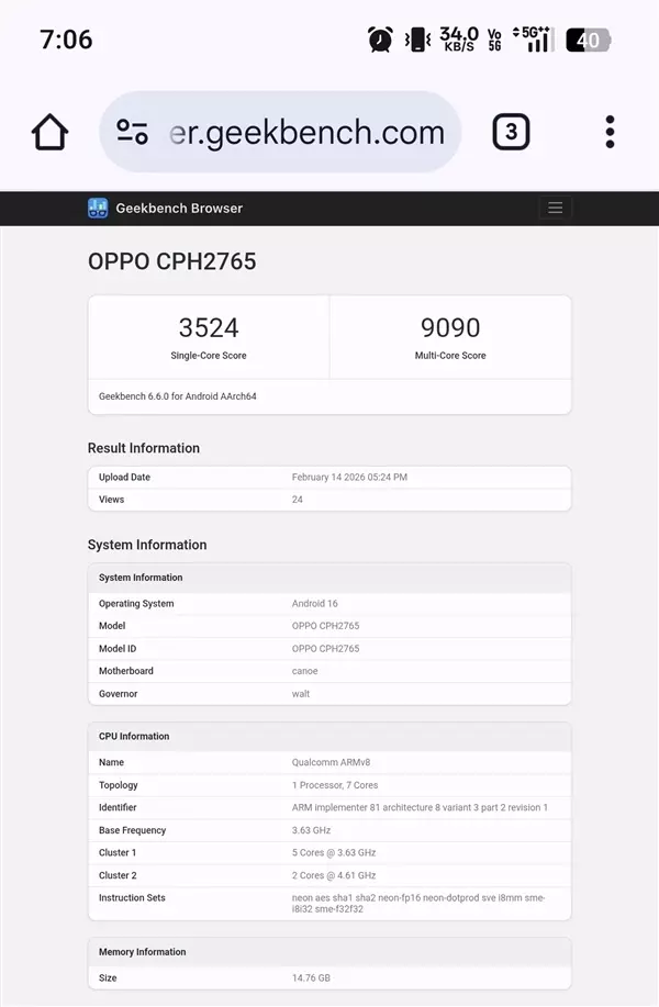 快科技2月16日消息, OPPO计划在春节后正式推出全新的折叠屏旗舰Find N6, 其型号为CPH2765,该机已经现身Geekbench跑分网站,引起了不小的关注。 最令人意外的是, 这款手机将全球首发新版高通骁龙8E5旗舰平台, 而且采用的是一种非常罕见的架构。 不同于常规版本骁龙8E5的8核心配置,Find N6搭载的是全新的7核心版本。 这颗芯片由2颗4.61GHz的超大核和5颗3.63GHz的大核组成,相比标准版少了一颗性能核心。