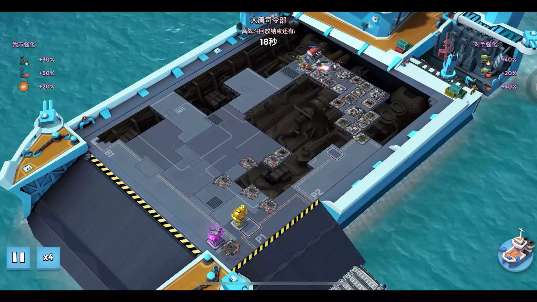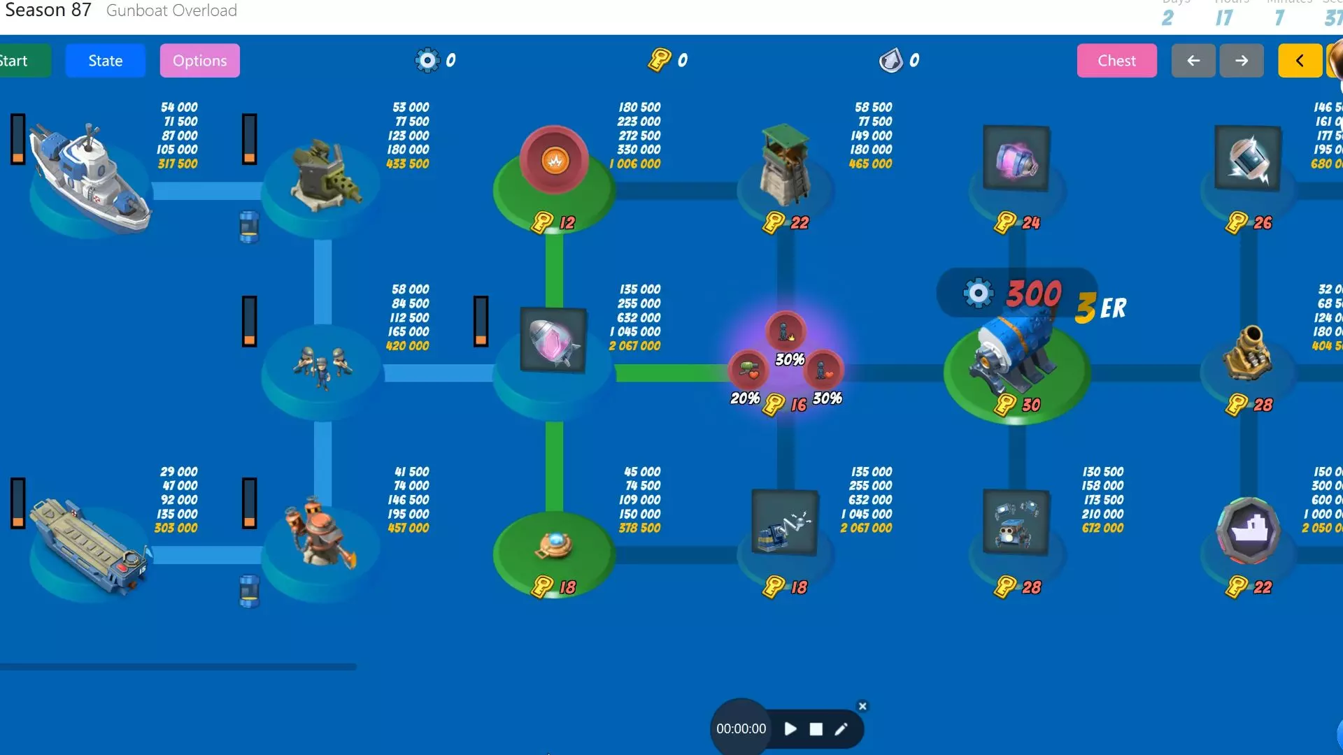 这是策略游戏《海岛奇兵》母舰87赛季第一天1段的开打内容,展示了母舰科技树升级、战舰能量升级、解锁震爆地雷等玩法,还有赛季奖励领取界面,呈现了该赛季初期的游戏操作与玩法内容。