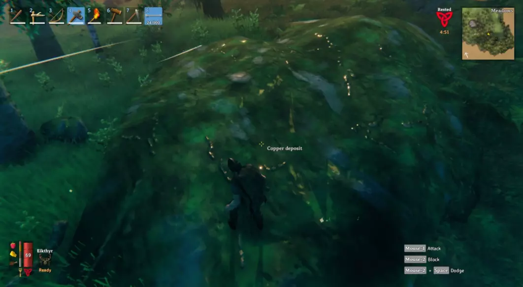 如何获取《英灵神殿》中的铜 只要击败了第一个 boss,在《英灵神殿》中获取铜的过程就相当简单。你需要前往黑森林;只需从起始区域出发,直到地图上的区域名称发生变化即可。 黑森林是一个更具挑战性的区域。灰矮人比你之前遇到的敌人更难对付,而 burial chambers( burial chambers)外部则由更强大的骷髅守卫。在黑森林附近建造一个小型基地是个不错的主意,这样你能更快回到死亡地点。 幸运的是,《英灵神殿》中的铜非常容易找到——它会出现在覆盖着苔藓的巨大绿色岩石中。这种岩石上还会有一些矿脉。将鼠标悬停在上面——如果显示【铜矿】,就可以开始开采了! 关于铜和矿石的最后一点说明——它们非常重。你一次只能携带大约20块铜,所以要一点一点带回主基地储存起来,以备后用。