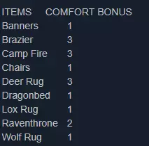 请注意,鹿皮地毯、狼皮地毯和lox皮地毯可以堆叠在一起。你可以将这三种地毯各最多5个堆叠在营火周围,这将为你提供额外的舒适度加成。舒适度部分内容复制自Gamertweak.com上的相关文章。