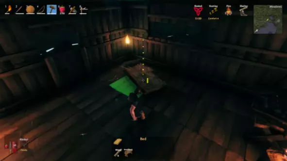 但别以为这样就完事了!在你真正使用工作台之前,它需要被基地保护起来。放置一面简单的墙壁和一块屋顶就足够了,但你也可以开始建造一个像样的维京家园。 由于森林地面相当不平坦,《英灵神殿》中的大多数建筑都需要地基。使用柱子和横梁来支撑你的地板和墙壁。请记住,在击败第一个 boss 后,这个基地经常会受到攻击,所以一定要确保它足够坚固。你应该把贵重的战利品放在里面。 6. 如何用床和营火建造《英灵神殿》的重生点