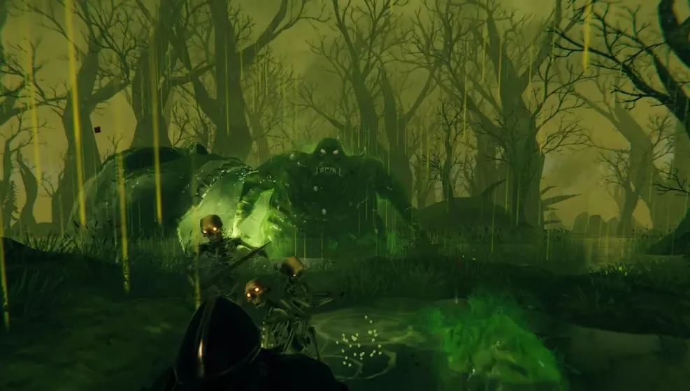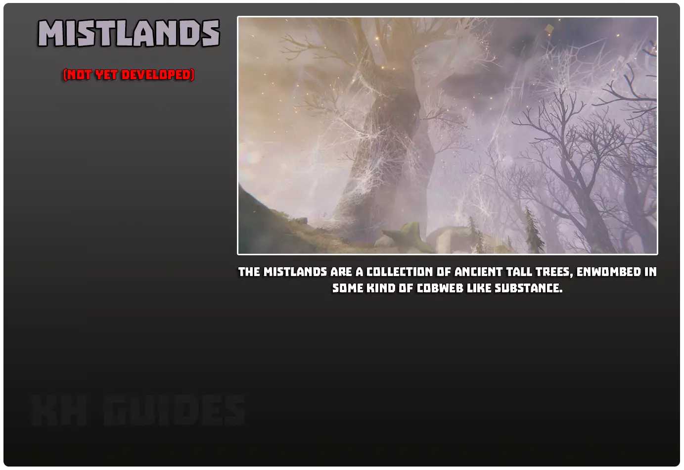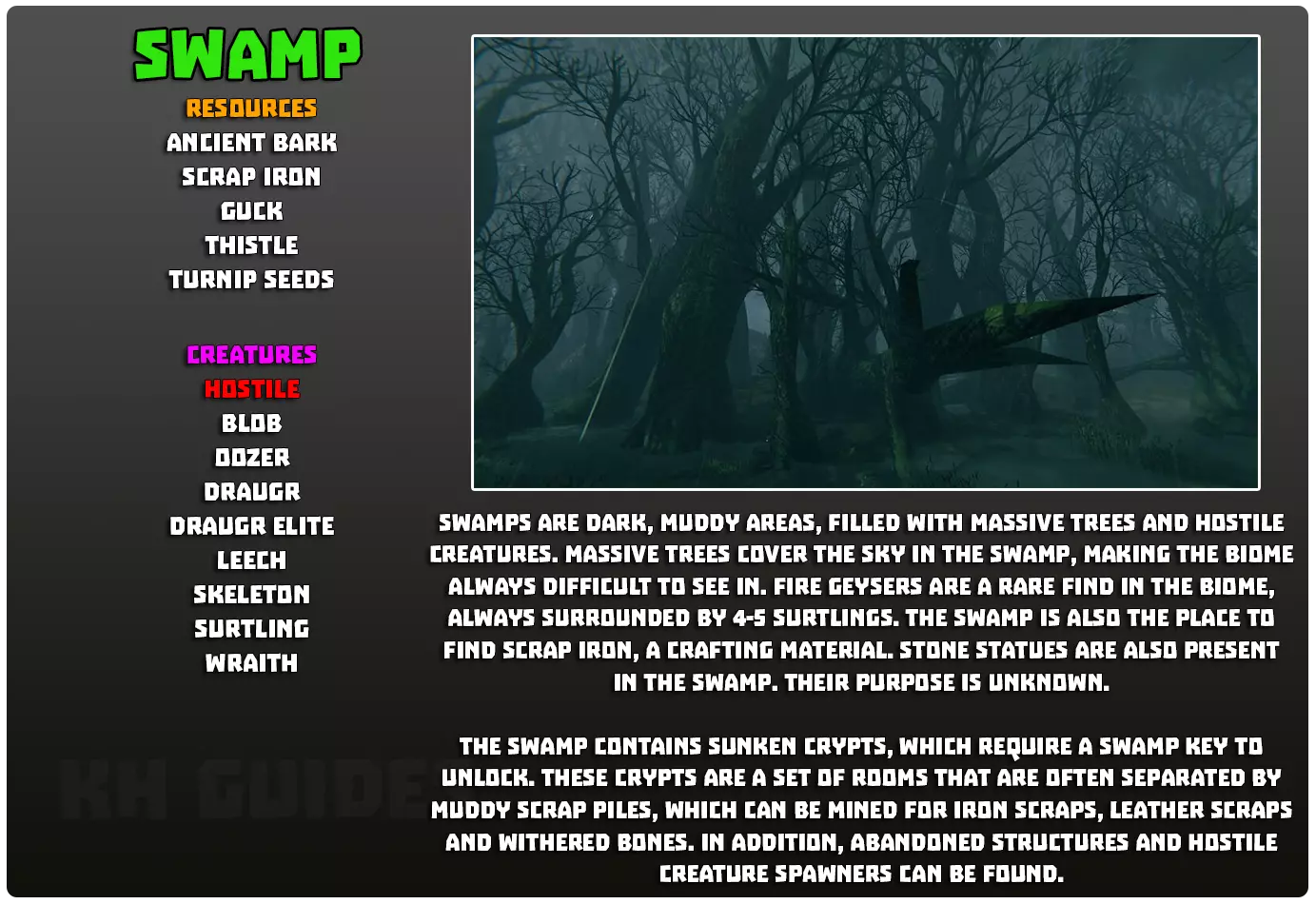 兴趣点: 维京墓地 - 形似维京船的岩石构造 符文石 - 一侧刻有红色符文的巨石,内含传说知识 巨石阵 - 由大约五块巨石环绕的地方 废弃房屋 - 木制的破败建筑,有时会有随机的战利品宝箱 林间空地 - 树木环绕的小型区域,地面覆盖泥土,中央有树桩 废弃前哨站 - 石制的破败塔楼,通常内外有尸鬼,周围有乌鸦飞舞,一般包含战利品宝箱 小型废墟 - 石制房屋的遗迹,内有受尸鬼保护的战利品宝箱 塔楼 - 石制建筑,顶部有两支火炬和一个战利品宝箱 坟墓 - 类似坟墓的建筑,设有通往地下城副本的入口这里经常被尸鬼环绕。地下城副本中也有大量尸鬼和装有战利品的箱子。 营地废墟——被墙壁环绕的小型圆形区域,内有一些杂物和一个装有战利品的箱子。这里也是森林巨魔的刷新点。 地穴——在沼泽中发现的砖砌建筑,前方有绿色火炬。需要沼泽钥匙才能打开。