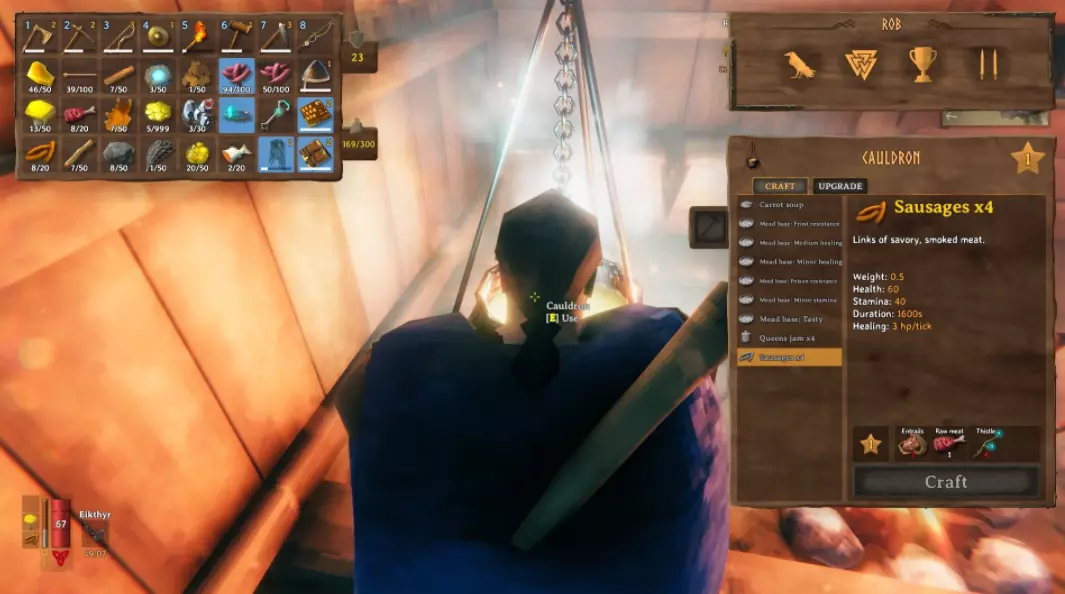 第二道餐品是胡萝卜汤。一碗胡萝卜汤的食材相当简单:一些蘑菇和胡萝卜。如果你需要种植胡萝卜的技巧,请查阅我们的农耕指南。如果你想获得最大的耐力提升和出色的生命恢复效果,这道菜就是你的目标。 最后是美味的香肠。每次制作可获得四根,它们重量轻,能提供最大的生命值加成和极佳的恢复效果。如果你觉得这一切好得难以置信,那是因为你还不知道所需的食材。制作香肠需要一些生肉、四捆蓟和两块内脏。生肉很容易获取,而蓟草在黑森林中随处可见,其显著特征是会发出绿色的光芒。最大的难点在于获取内脏,因为只有沼泽生物群系中出现的尸鬼才会掉落。如果你难以抵达沼泽区域,我们也会为你提供相关帮助。