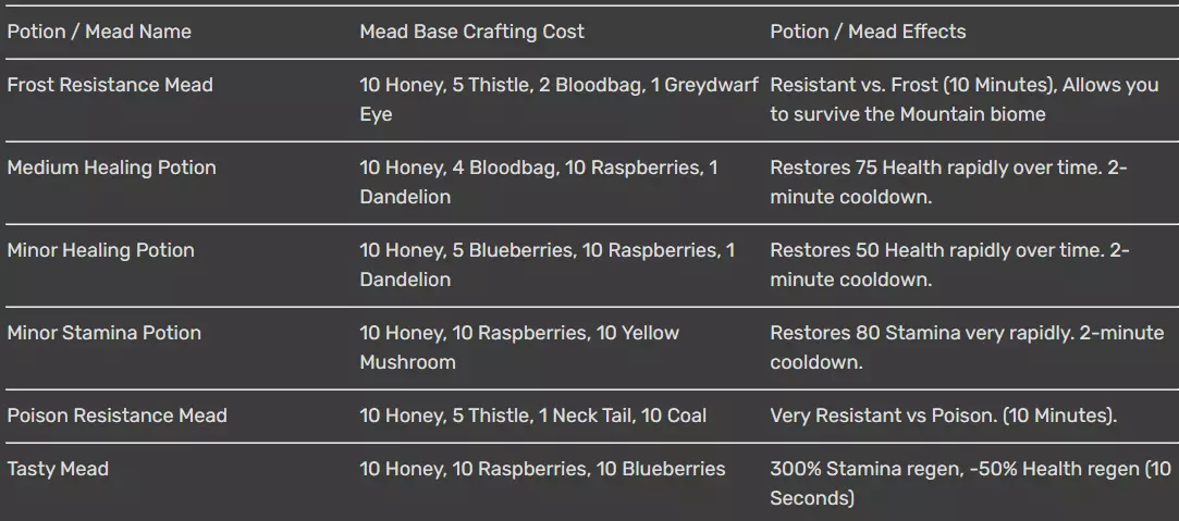 开始酿造蜜酒和药水所需物品 制作《英灵神殿》的药水和蜜酒,在满足基本要求后是相当简单的事情。首先,你需要能够炼制金属——这意味着你必须击败游戏的第一个 boss 古树长老,以获得鹤嘴锄。【工作台】 10木材 【熔炉】 工作台 4石头 4煤炭 10木材 6铜 1青铜斧(用于砍伐桦树获取细木) 熔炉 4木材 8青铜 2皮革碎片 1蜂箱 工作台 10木材 1女王蜂 1营火 5石头 2木材 1坩埚 熔炉 10锡 1发酵桶 熔炉 20细木 5青铜 10树脂 你还需要记住,仅拥有工作站和工具是不够的——你还必须收集到蜜酒基底配方中的每一种原料,才能实际制作蜜酒。(本指南末尾列出了我们目前发现的所有《英灵神殿》药水和蜜酒配方。)