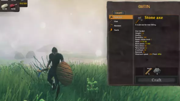 对于熟悉生存类游戏的玩家来说,这或许并不意外,但在《英灵神殿》的世界中生成角色后,你首先要做的就是收集木材和石头。看到那些较小的树木了吗?只需徒手击打它们,直到它们断裂成木 log。 至于石头,则需要你去拾取。你只能获取那些小石块,所以在树林中行走时要留意它们。 在收集这些资源的过程中,你很快就会遇到第一批敌人——灰矮人。不过不必过于担心,灰矮人相当弱小,几下拳头就能将它们击败。 3. 制作斧头和锤子来建造你的第一个基地