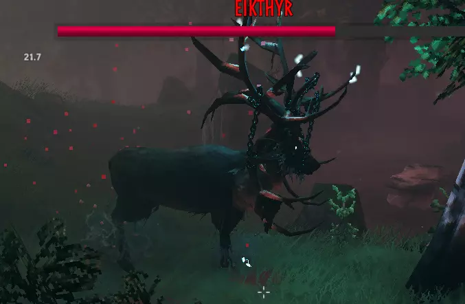描述 Eikthyr是《英灵神殿》的第一个Boss。它是一只巨大的雄鹿,身上缠绕着锁链,鹿角带有电流。 攻击方式 Eikthyr有三种不同的攻击方式: - 向前发动的远程闪电攻击。 - 大范围的闪电攻击。 - 用鹿角进行的近战突进攻击。 位置 在出生点,Eikthyr的献祭石左侧,有一块发光的小石头。与这块石头互动后,地图上会出现一个新图标,指示最近的Eikthyr召唤祭坛的位置。 在 Meadows生物群系中可以找到多个祭坛。 打法技巧 使用初始的木盾和燧石矛就能轻松击败Eikthyr。它的攻击很容易格挡,在攻击间隙用矛刺击,玩家可以在三分钟内将其击败。或者,使用粗制弓搭配木箭或燧石箭可以相对轻松地风筝他。 建议食用三种不同食物组成的营养餐(例如1块熟肉、1份烤颈尾肉以及1份树莓或蘑菇),以获得最大生命值和耐力。此外,在召唤古树长老前一晚,通过在床上睡觉获得【休息效果】也是推荐做法。 【被遗忘的力量】 击杀古树长老后会掉落其战利品。将该战利品带回出生点,可将其挂载到对应石碑上悬挂的钩子上(必须激活钩子,而非钩子所悬挂的石碑)。这使玩家能够通过按F键激活古树长老的被遗忘的力量。激活后,玩家在5分钟内跑步和跳跃时的耐力消耗将减少50%。该能力有20分钟的冷却时间。 掉落物 Eikthyr战利品,硬鹿角×3 The Elder