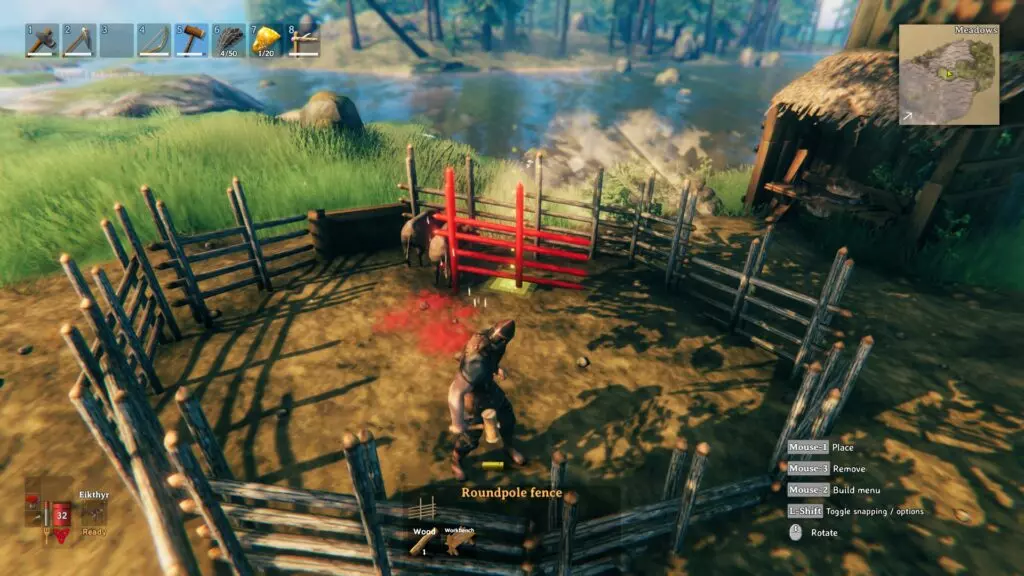 在《英灵神殿》中驯服狼的基本方法与驯服野猪类似,但由于狼能在几秒内对你造成严重伤害,因此需要做一些调整。首先,你得前往狼的刷新地点——寒冷的山脉生物群系。所以,一定要准备好抗寒药剂,或者搭建一条篝火路径。 接下来,用 stakewall(尖桩墙)建造围栏;普通栅栏即使能困住狼,也撑不了多久。建好围栏后,你可以用生肉引诱狼进入围栏,或者用自己当诱饵。如果你选择后者(真是个猛人),确保至少有一面青铜盾牌,比如小圆盾,来保护自己。当狼进入围栏时,迅速放下最后一段墙壁。 困住狼后,一定要定期喂它生肉。同时,要修复围栏的墙壁,因为你一靠近,这头野兽就会开始四处冲撞。还有,把肉扔进去后,一定要走开,这样它才不会害怕。你可能需要搭建一个平台来扔肉。 一旦狼被驯服,你就可以像养野猪一样繁殖它们,这很有趣。更重要的是,如果你抚摸驯服的狼,它就会开始跟着你。如果你和你的宠物们(两只、三只或更多,不管你驯服了多少只)遇到敌人,它们会绝对攻击并在你身边战斗。这简直太棒了。 如何驯服英灵神殿中的洛克斯