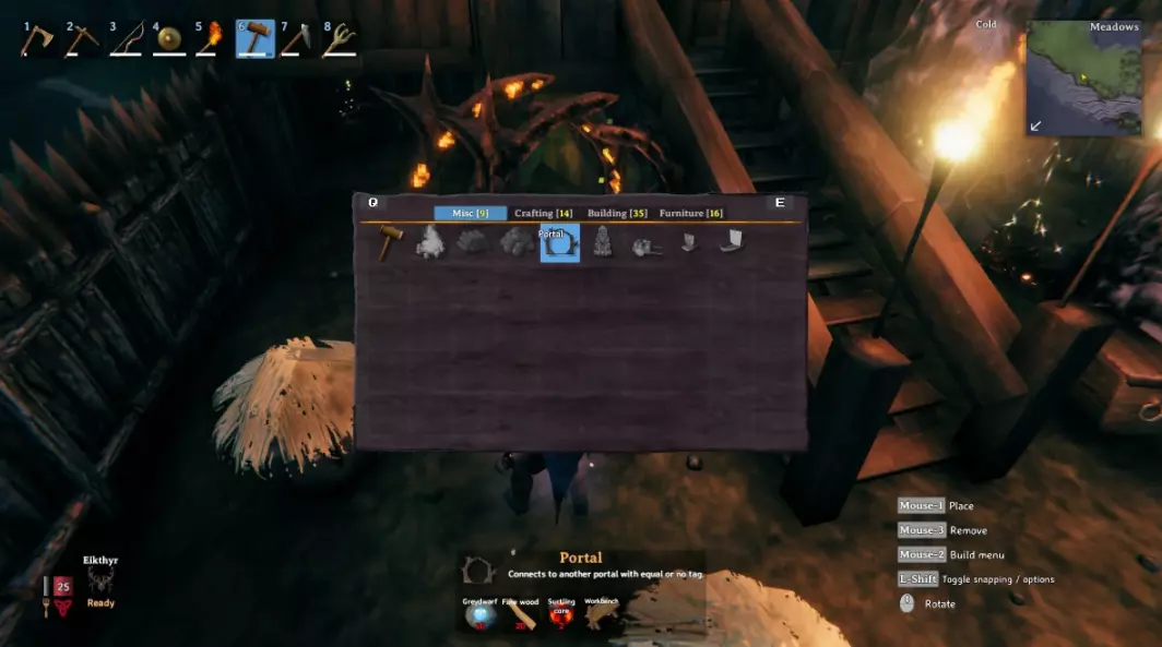 按Tab键可以打开物品栏和制作菜单。你需要的第一个工具是石斧:使用5块木头和4块石头制作。这将帮助你更快地砍树。这很重要,因为我们需要大量木头来建造第一个瓦尔海姆基地。 接下来,用3块木头和2块石头制作一把锤子。装备这个工具开始建造基地。右键点击打开包含不同建筑材料的菜单,左键点击放置材料,鼠标中键可以免费拆除任何建筑部件。 4.如何制作瓦尔海姆工作台并创建建造区域