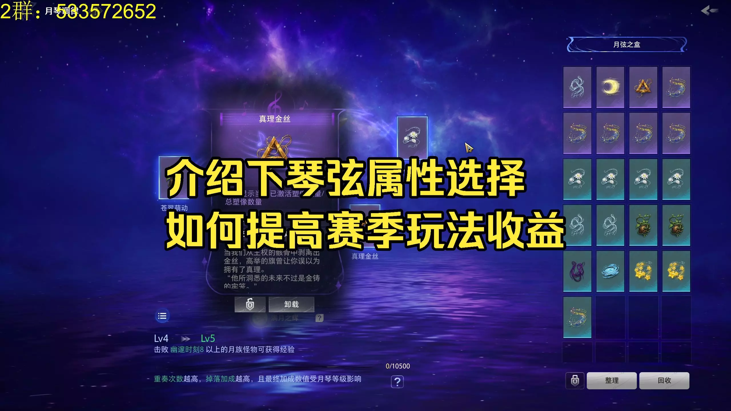 这是一篇游戏杂谈帖,分享第二天刷到900E、获取2W火的游戏成果,重点介绍游戏中琴弦搭配方法,展示了镜湖涟漪、白昙弦丝等琴弦的属性效果,助力玩家提升游戏收益。