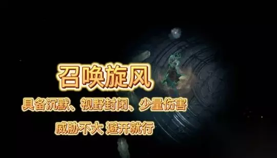 第四随机召唤移动的旋风,具有沉默视野封闭少量伤害,这个技能的话对于我们的威胁不是很大,就是避开或者走出来就行。
