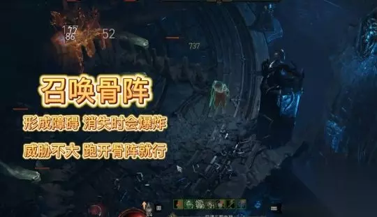 第五血量低于50%之后boss会召唤骨阵,骨阵会形成障碍,而且在体骨阵消失的时候会形成爆炸,所以对于这个技能的话我们往外围跑或者是离开。