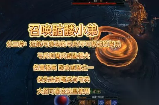第三随机召唤骷髅小兵,小兵分三种,一种是拿刀或者活的近战,一种是可移动的弓兵,一种是不可移动的弩兵,其中弩兵和弓兵对于我们的威胁最大,这里我一般会把大招留在这个场合上。