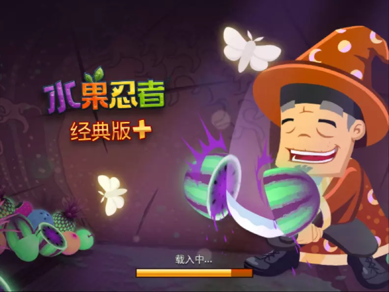这是《水果忍者》经典版的相关内容,展示了游戏内的道具界面、切水果玩法界面,还有全新的月蛾刀刃,该刀刃有额外积分、催生百宝罐等特殊效果,同时呈现了存档冲突的选择界面。